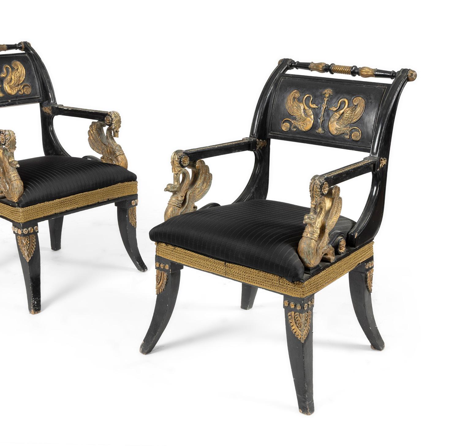 A REGENCY EBONISED AND GILT DECORATED SETTEE