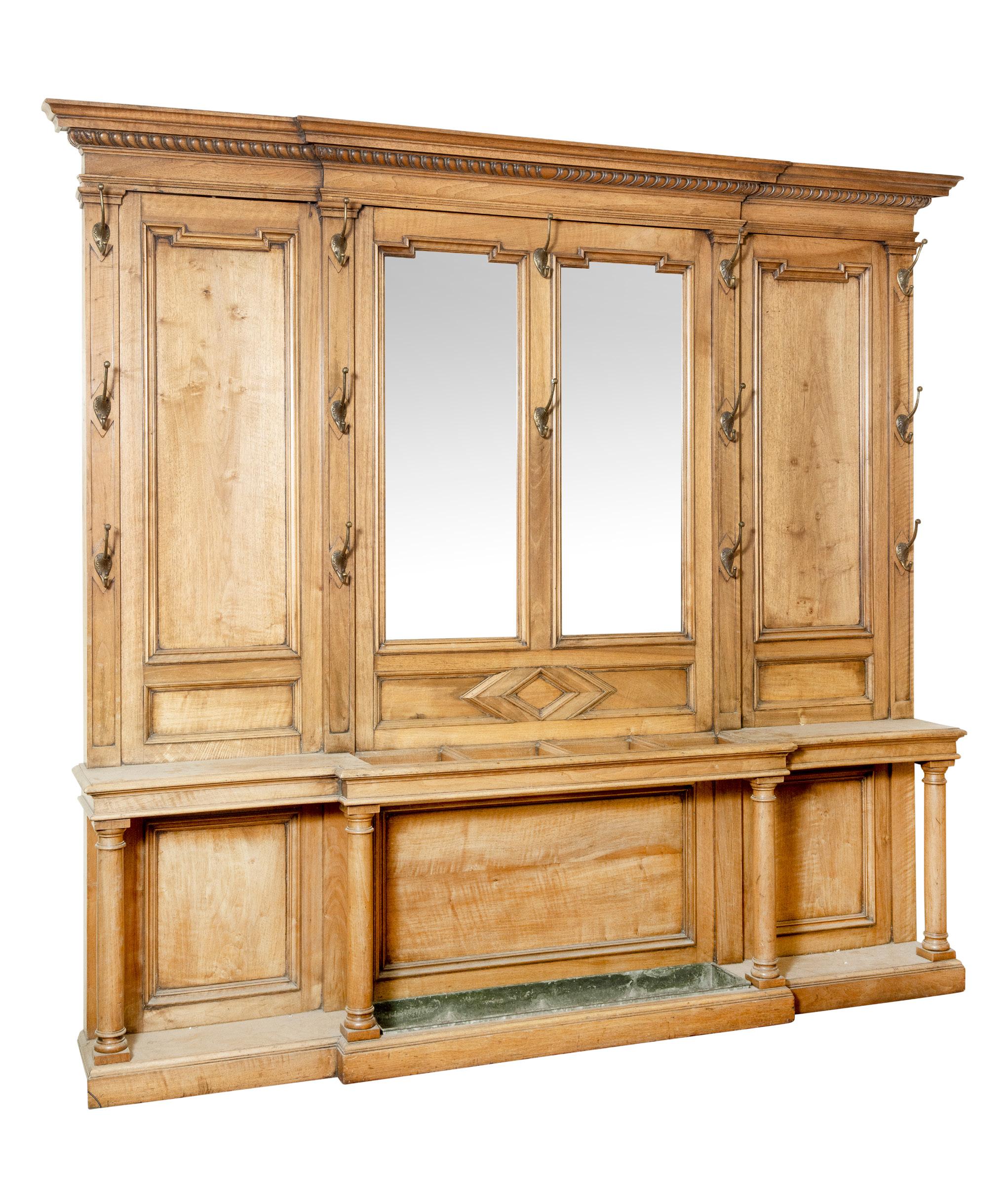 the moulded breakfront and gadrooned cornice above mirrored and panelled backs, set with coat hooks, the lower section with stick and umbrella compartments, with removable drip tray, flanked by turned columns (2) 240cm wide x 221cm high x 38cm deep