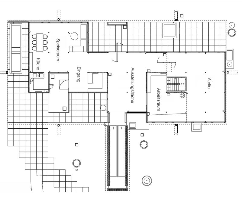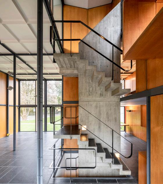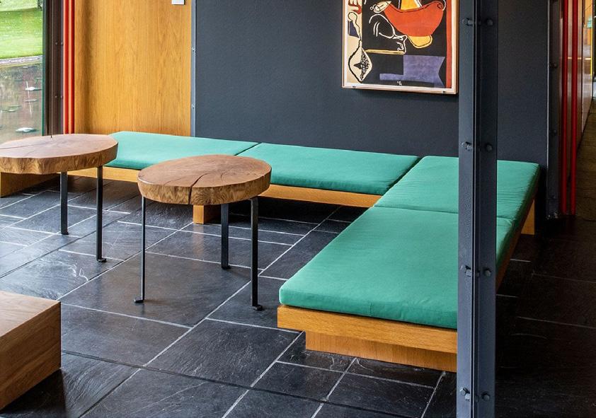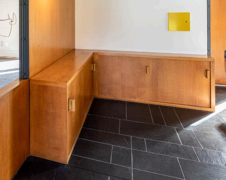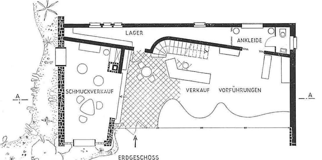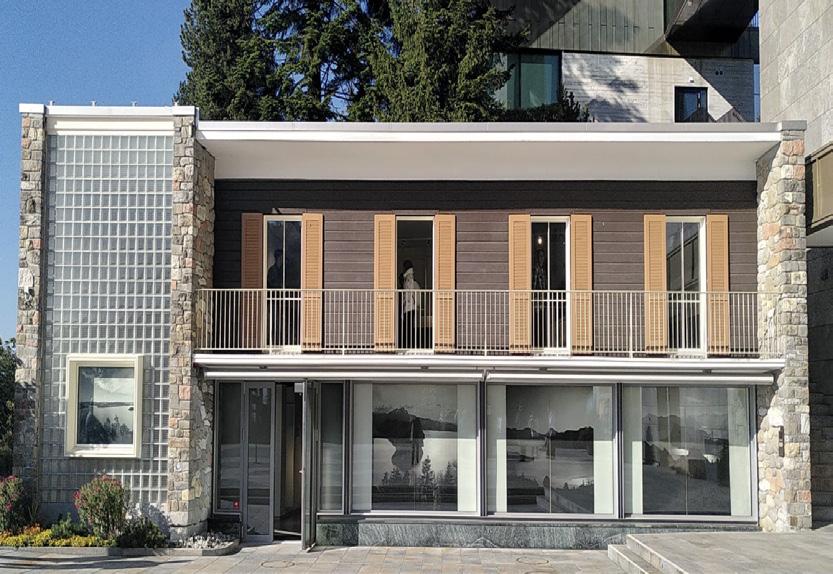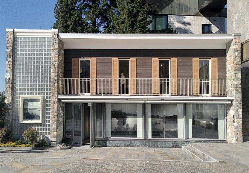 The Bürgenstock Bazaar is one of these structural additions. It was designed by the Lucerne architect August Boyer in collaboration with Frey. The salesroom provided shop space for the Gübelin jewellery and watch company and for a fashion house. The two-storey bazaar is enclosed on three sides by a solid natural stone wall, accentuated by a few window openings. The restaurant opens all the more impressively onto the piazza with an attractive shop-window front. While the balcony on this side separates the single-storey part of the salesroom on the ground foor – generously ftted out with windows – from the upper foor, a vertical glass-block wall with an embedded jewellery showcase on the ground foor in front of the two-storey part of the salesroom visually reunites the building. Behind the architectural design is the endeavour to fnd a modern design language that blends harmoniously with local materials such as natural stone into the historically impressive surroundings, a design that also appealed to the architectural spirit of the times in the United States.1