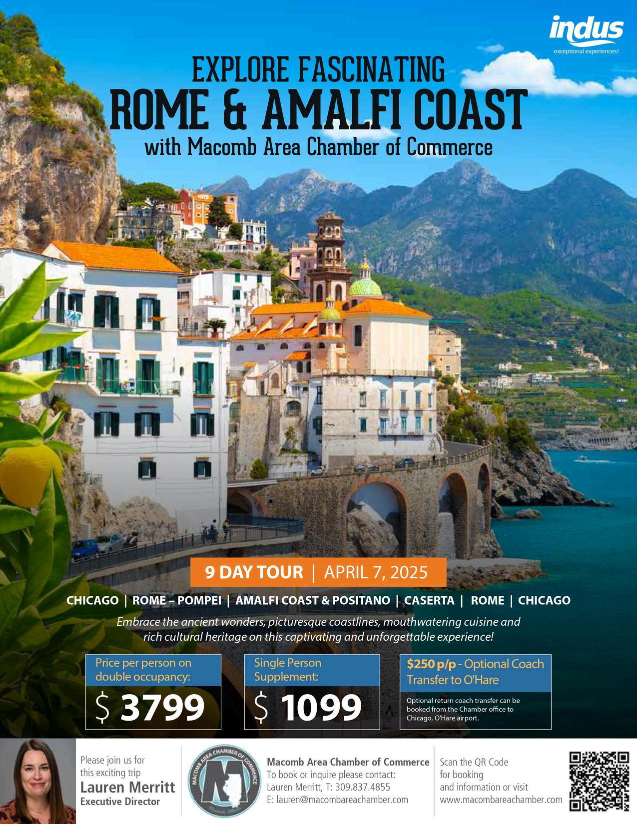 August has plenty of exciting events in store! Our Downtown Block Party is on August 23 from 4:30-6:30 in Chandler Park. Businesses can reserve a space to set up along the sidewalks. We are also accepting logo sponsorships for the t-shirts that we will distribute during the event. The cost is $250 for a large logo and $125 for a small logo. Please let us know by August 8 if you’re interested in sponsoring. Looking ahead, join us next spring for a nine-day adventure in Italy! We’re organizing a group trip to Rome and the Amalfi Coast in April 2025. Check out the flyer below for more details—it’s an incredible opportunity!