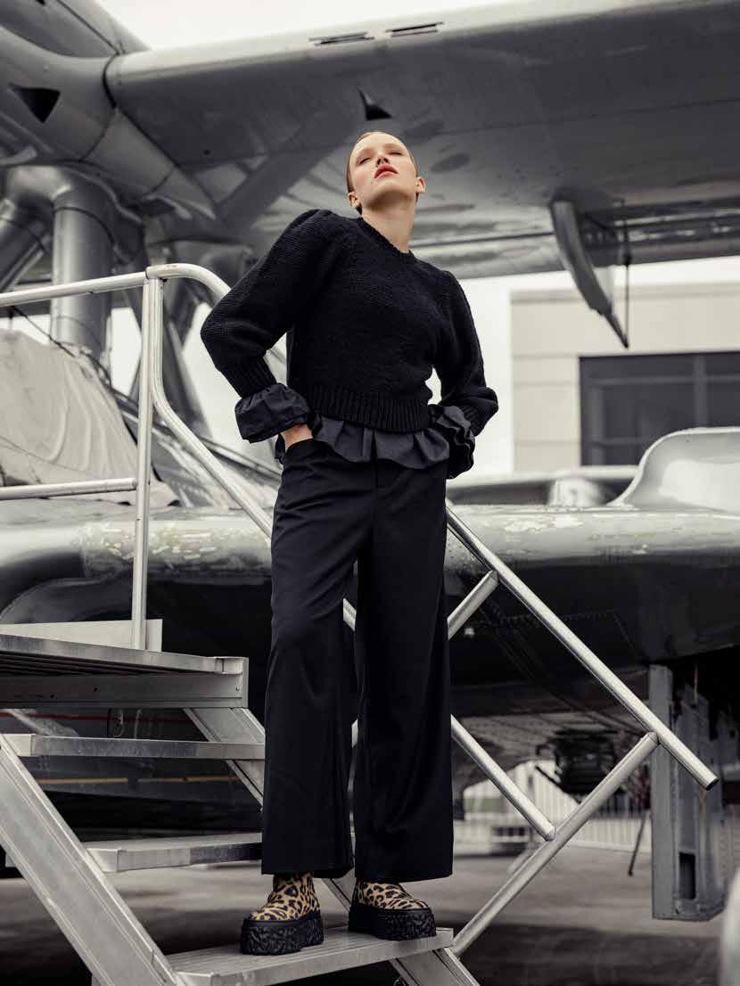Brilliert nicht nur vor der Kamera: Model und Filmproduzentin Nora Einwaller. Wenn sie gerade nicht für unsere aktuelle Modestrecke posiert, steht sie selbst hinter der Linse und holt sich mit ihren Werken Preise ab. Gerade wurde sie für ihren Film Asche beim Filmfestival Diagonale mit dem Preis für Bildgestaltung ausgezeichnet, denn sie „schafft kraftvolle und wuchtige Bilder – Bilder einer neuen Generation“, so die Jury. Kampagnen mit SusanneBisovsky und Covershootings für Rondo und Elle beschäftigen sie ebenso wie die Zusammenarbeit mit Musiker:innen. Die junge Kamerafrau hat ein Faible für Musikvideos. Ihr Motto: „Striking poses and capturing frames – why choose when you can do both.“