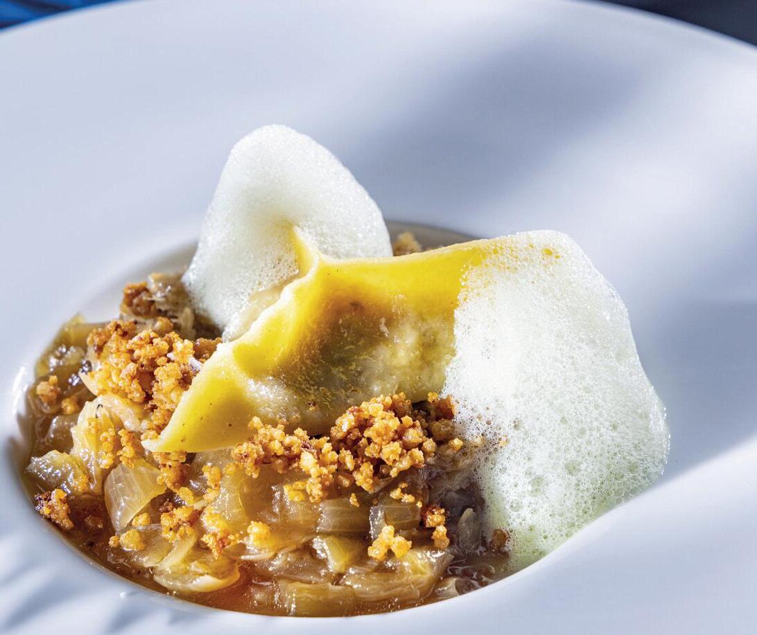 Fülle als Basis auf den Teller geben, Teigtasche daraufsetzen, mit Zwiebelsud und Kernölschaum garnieren und mit Grammeln bestreuen.