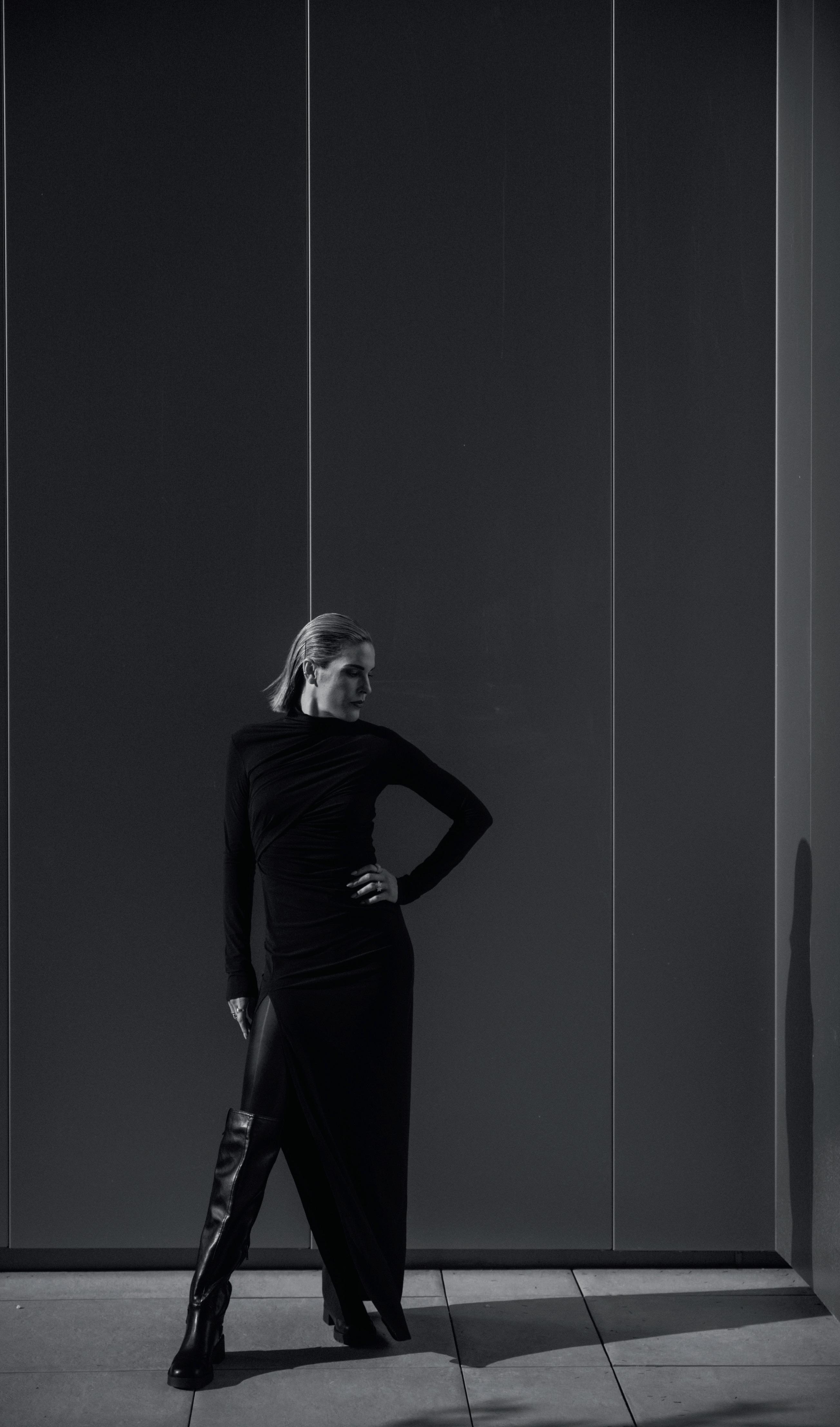 Der Anzug sitzt nach Maß. Sie zieht ihre Krawatte stra nach oben und hebt dabei das Kinn einen kurzen Moment so an, als würde sie herausfordernd auf die Welt herabblicken – nur um sich dann doch wieder mit gerader Haltung nach vorne auf ein Ziel zu richten. Mit souveräner Präsenz nimmt sie auf dem Sofa Platz – dominant, selbstbewusst, ganz in Womanspreading-Manier. Ein kurzer Moment der Stille, dann klickt die Kamera. Fotograf Benedikt Haushofer hat Moderatorin, Mama und Businessfrau Elke Rock genau so eingefangen, wie sie sich selbst sieht: stark, klar, zielstrebig.