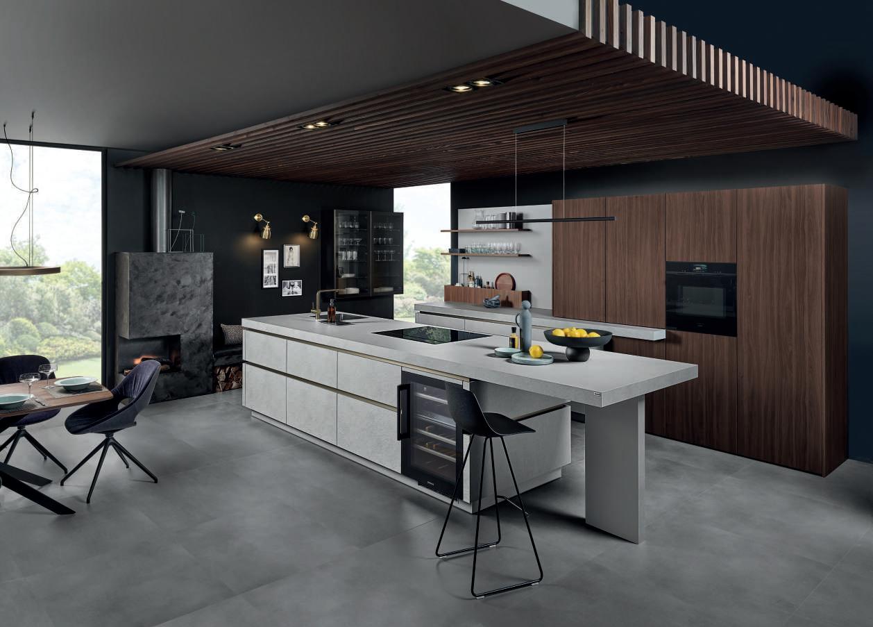 Die Kücheninsel der Ewe Cemento in Malta Grigio zieht sofort alle Blicke auf sich – mit ihrer hochwertigen Relief-Oberfläche, die Beton täuschend echt nachbildet. Sie vereint Stauraum, Arbeitsfläche und eine gemütliche Sitznische zu einer harmonischen Einheit, in der Design und Funktion perfekt verschmelzen. Die stilvolle Kombination mit Nuss Pavia-Elementen sorgt für einen warmen, einladenden Rahmen, der sich nahtlos in den Wohnbereich integrieren lässt.