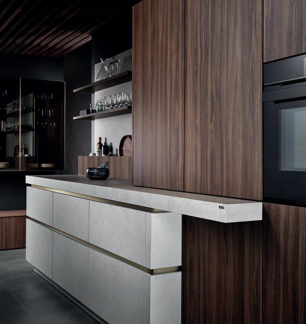 Die Kücheninsel der Ewe Cemento in Malta Grigio zieht sofort alle Blicke auf sich – mit ihrer hochwertigen Relief-Oberfläche, die Beton täuschend echt nachbildet. Sie vereint Stauraum, Arbeitsfläche und eine gemütliche Sitznische zu einer harmonischen Einheit, in der Design und Funktion perfekt verschmelzen. Die stilvolle Kombination mit Nuss Pavia-Elementen sorgt für einen warmen, einladenden Rahmen, der sich nahtlos in den Wohnbereich integrieren lässt.
