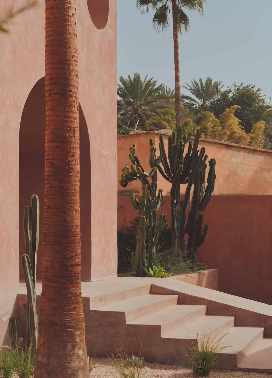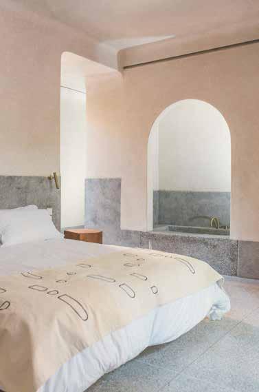 auf Schallerts Idee. Inspiriert von der lokalen Tonalität sowie dem historischen Reichtum der Stadt, spricht das Boutiquehotel eine traditionelle und gleichzeitig moderne, ästhetische Sprache, die dem Gebäude schlussendlich eine ganz eigene Rhetorik verleiht. Das zeigt sich unter anderem im Inneren des Hauses. Hier entfaltet sich durch die Vermischung von Tradition und Design eine neuartige, harmonische Stimmigkeit. Terrazzoböden gehen nahtlos in das traditionell marokkanische Tadelakt über. Elegante, maßgefertigte Möbel, handgefertigt von lokalen Unternehmen, werden mit Designklassikern wie » Egon-Eiermann-Stühlen « kombiniert. Kunstwerke internationaler Kreativschaffender kreieren eine schlichte Anmut, die reich an Detail und Ästhetik ist.