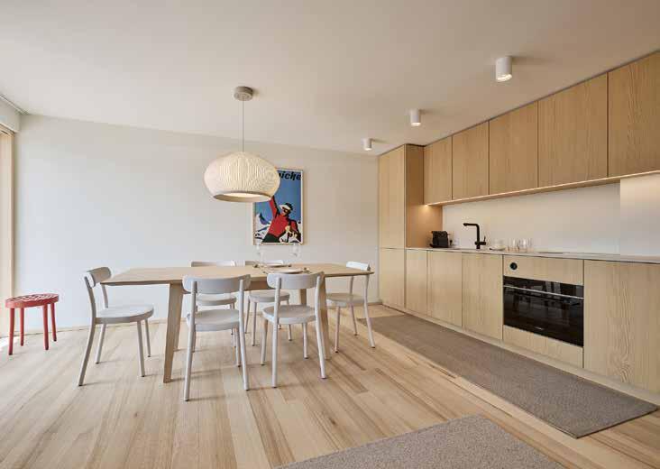 Küche und Wohnraum verschmelzen zu einem Zentrum des Lebens. Hier wird gekocht, gelacht, geteilt. Massivholz trifft auf sanft gebrochene Töne, handverlesene Texturen bringen Ruhe, Wärme und gemütliche Eleganz. Die matten Farben lassen Erinnerungen an weite Landschaften aufleben – das Draussen holt sich seinen Platz im Innen.