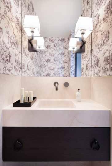 Tapeten in expressiven Mustern sowie akzentuierende Leuchtobjekte aus Messing setzen gezielte gestalterische Statements.