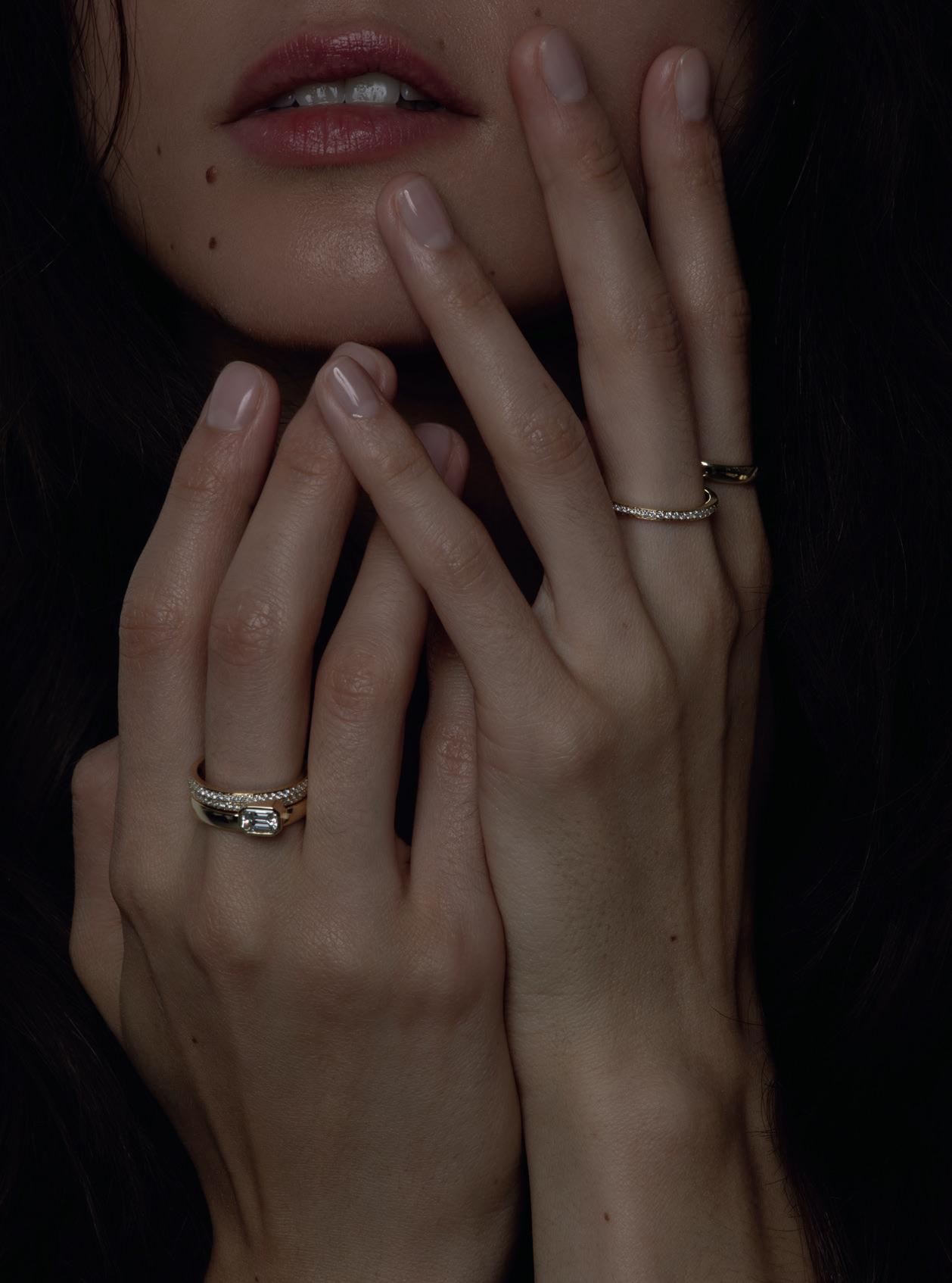 Oben: Kette aus 18-karätigem Weißgold mit Diamanten, € 4.600,–Rechts: Horsebit Contrarié Ring aus 14-karätigem Gold, € 4.300,–