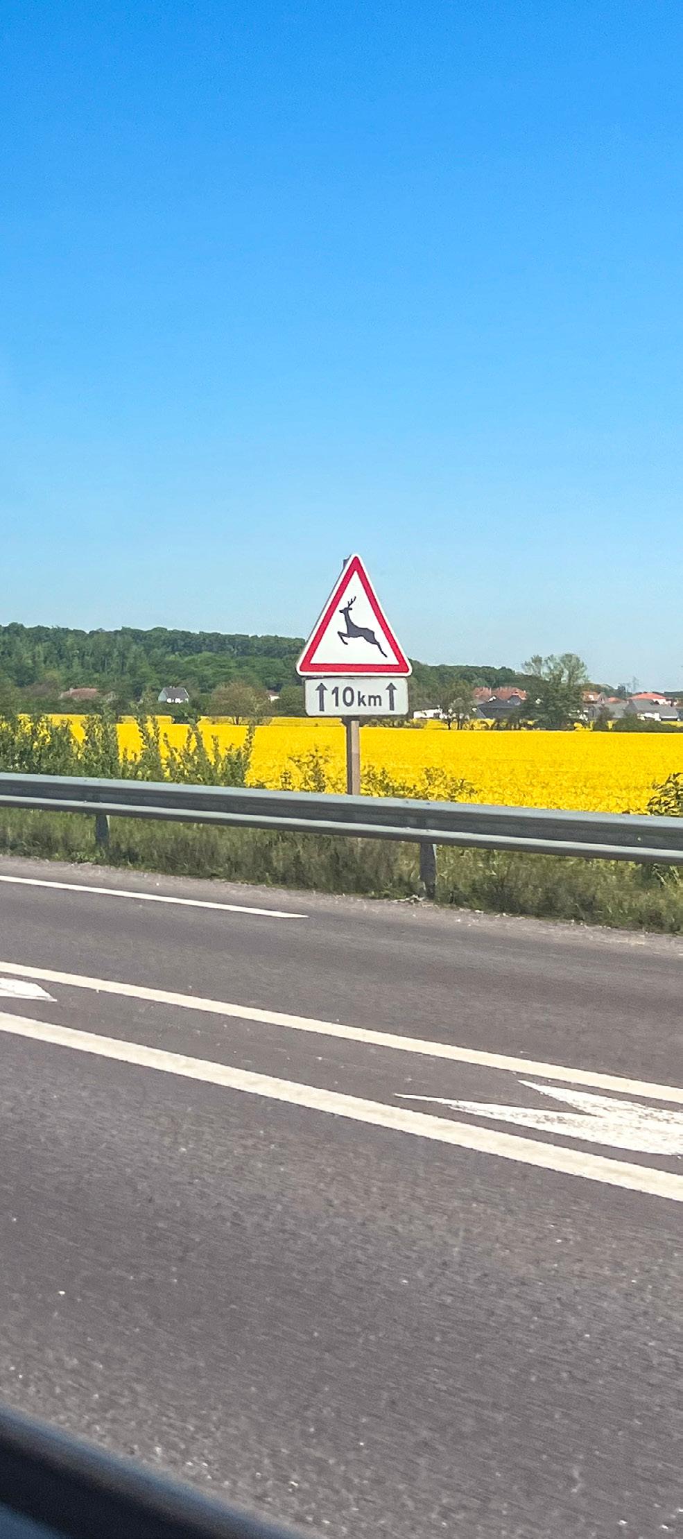 z tym stosowanym we Francji. W Polsce znak ograniczający prędkość, albo inny znak, pojawia się zbyt późno – dopiero niestety równo z rozwidleniem dróg, chyba że zastosowana została bramownica i znak umieszczono na niej. Podobnie jak brakuje znaku prędkości zalecanej, brakuje również oznakowania strzałką znaku odnoszącego się do konkretnego pasa ruchu. I na koniec znak, co do którego ani w Polsce, ani we Francji nie potrafię się odpowiednio dostosować. Stanowi on prawdopodobnie próbę uwolnienia się od odpowiedzialności zarządzającego ruchem za pojawienie się na jezdni dzikich zwierząt przez nieszczelne siatki zabezpieczające. Ale jak tu jechać autostradą 10 km z prędkością, przyjmijmy 60 km/h, bo chyba tylko taka pozwoliłaby wybrnąć z sytuacji w przypadku nagłego