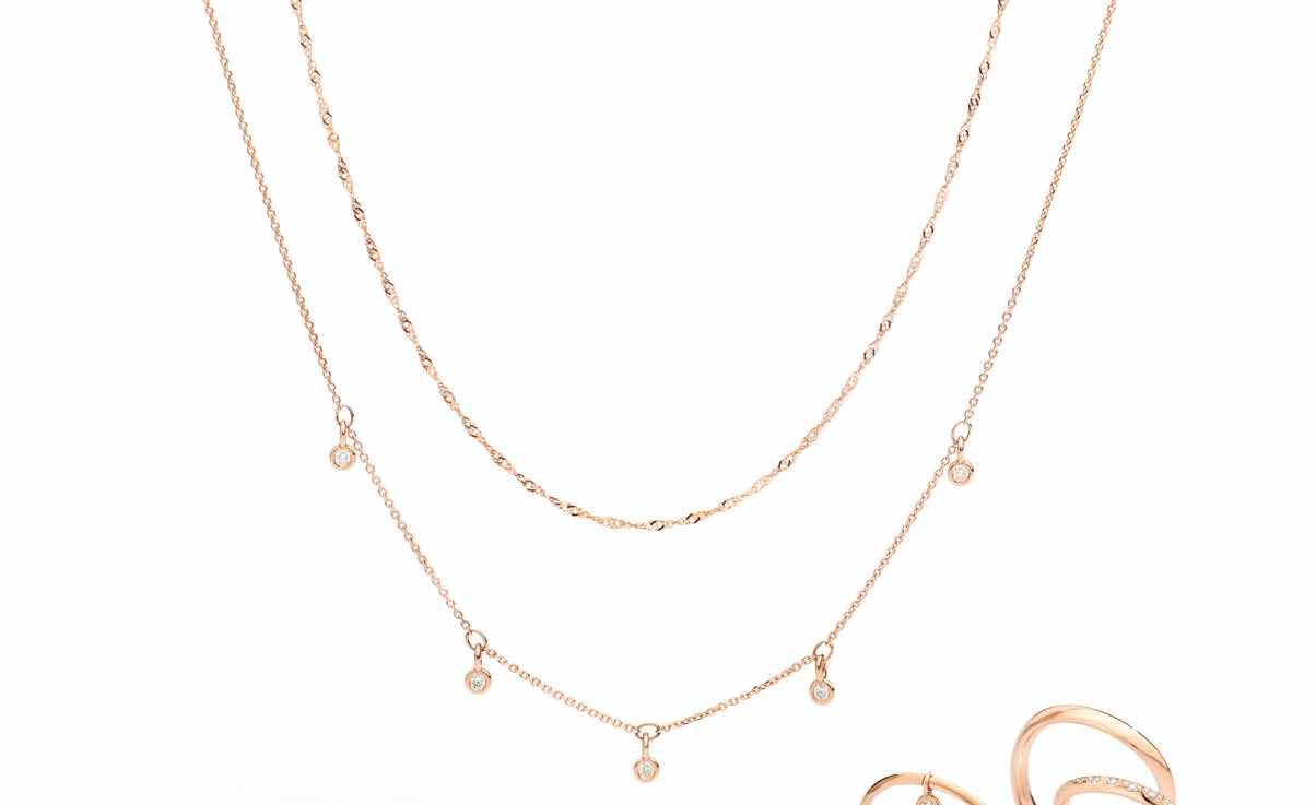 Due invece le sottili catene proposte in collezione. Regolabili in tre misure sono decorative ma non appariscenti, da indossare singolarmente o abbinate tra di loro. In oro rosa 9k, una catena rivela link ritorti che riflettono la luce in maniera inaspettata. L’altra, più preziosa, è costellata da 5 diamanti pendenti incorniciati nell’oro rosa con retro à jour: la gemma è visibile in tutta la sua purezza.