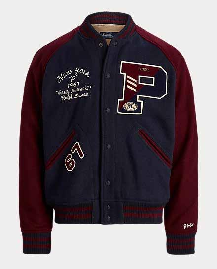 Made of soft wool-blend fabric, this college-style jacket features an array of '90s sports graphics for an authentic vintage look.
