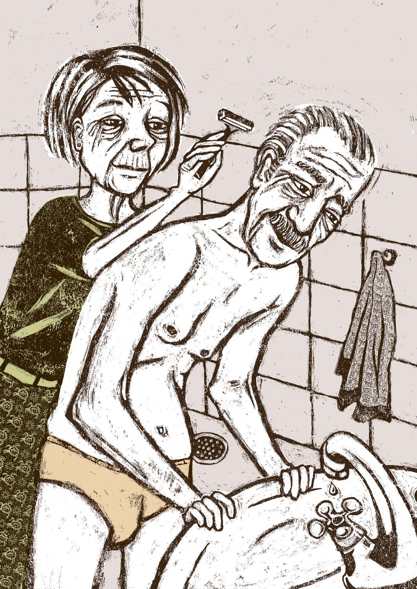 Dei er på badet, og Helga seier: – Hugo da, du ser ut som ein lasaron. Gi meg høvelen og bøy deg fram!