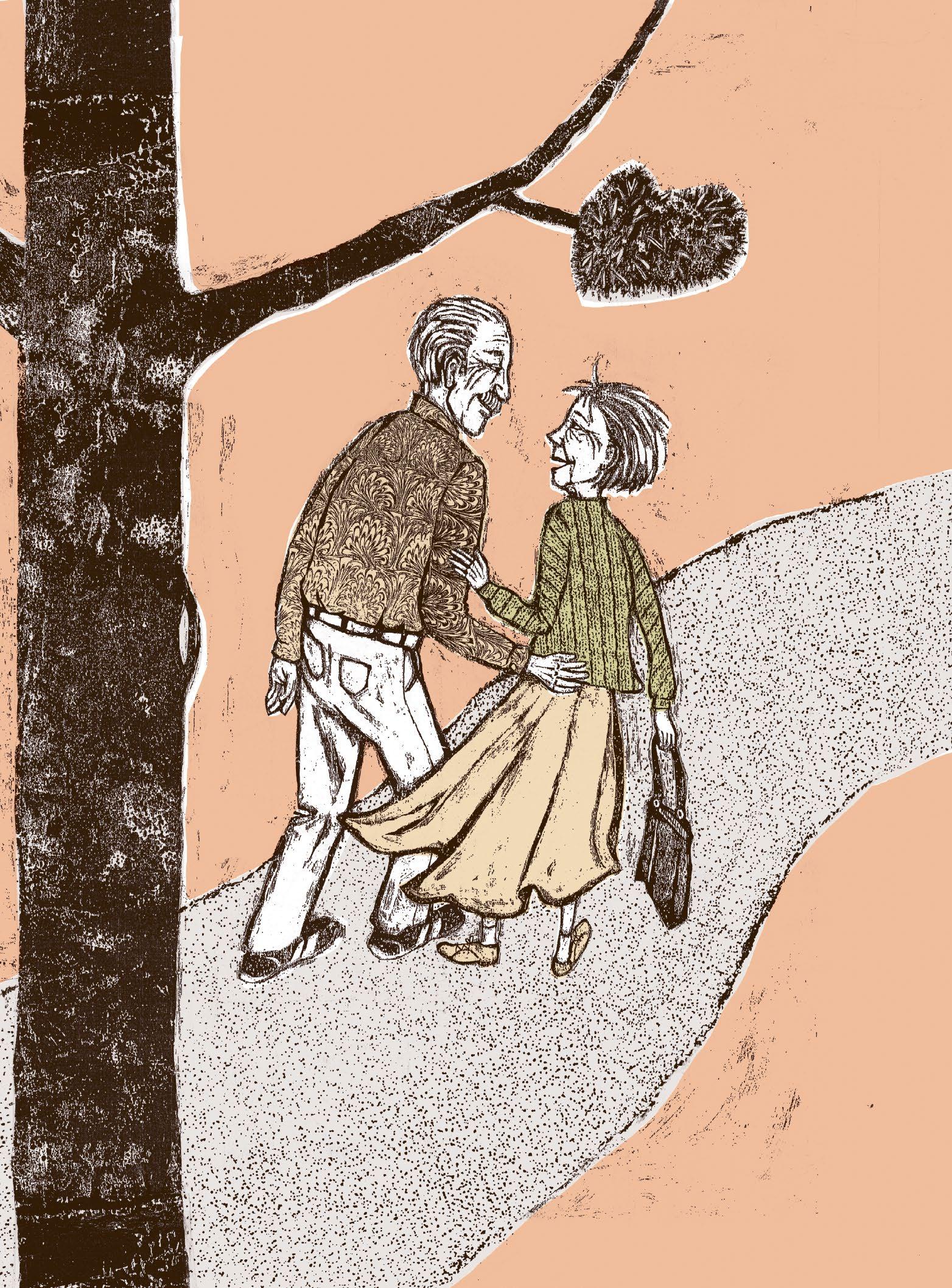 Idet dei sneiar forbi huset til naboen, legg Hugo armen rundt Helga.