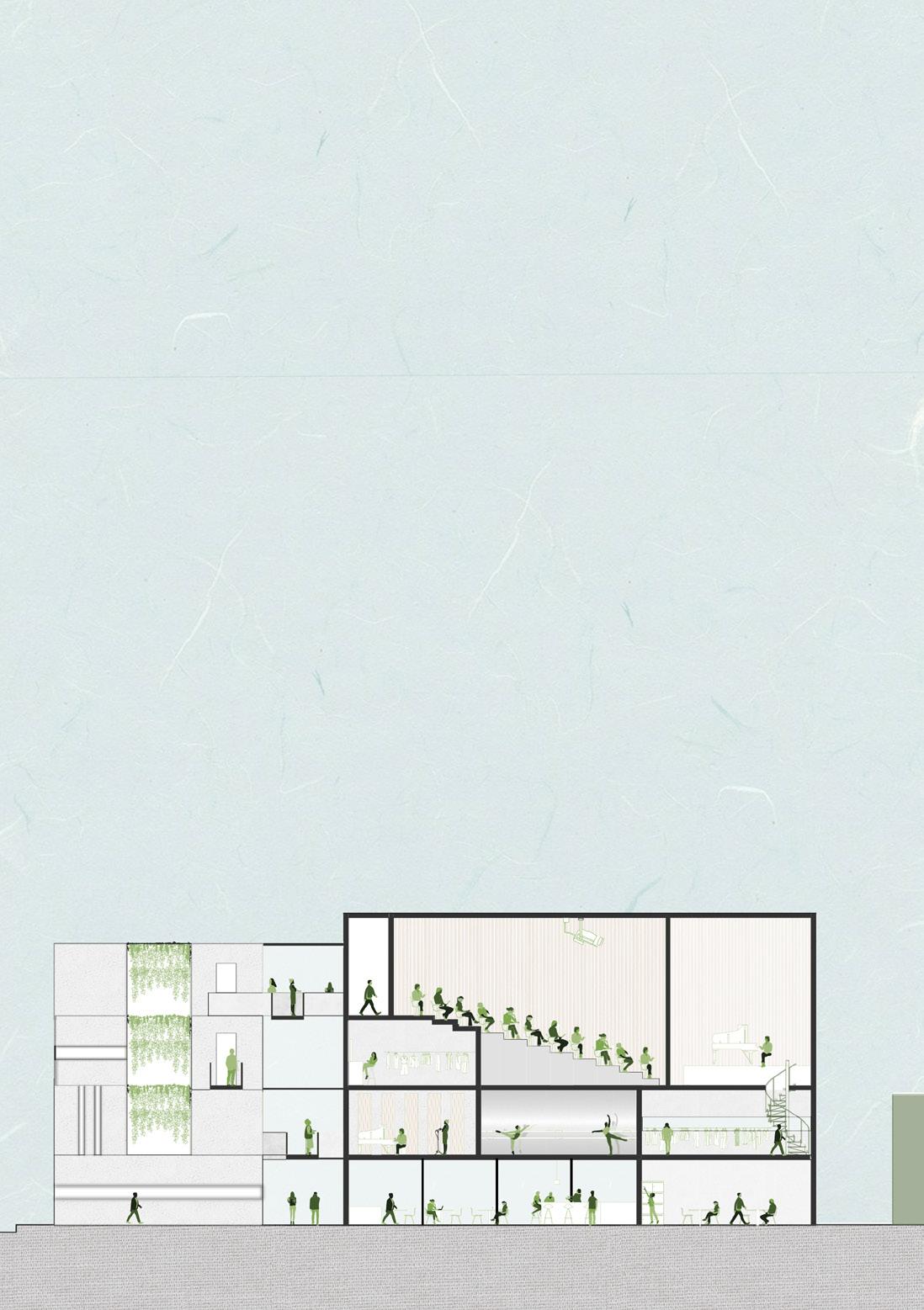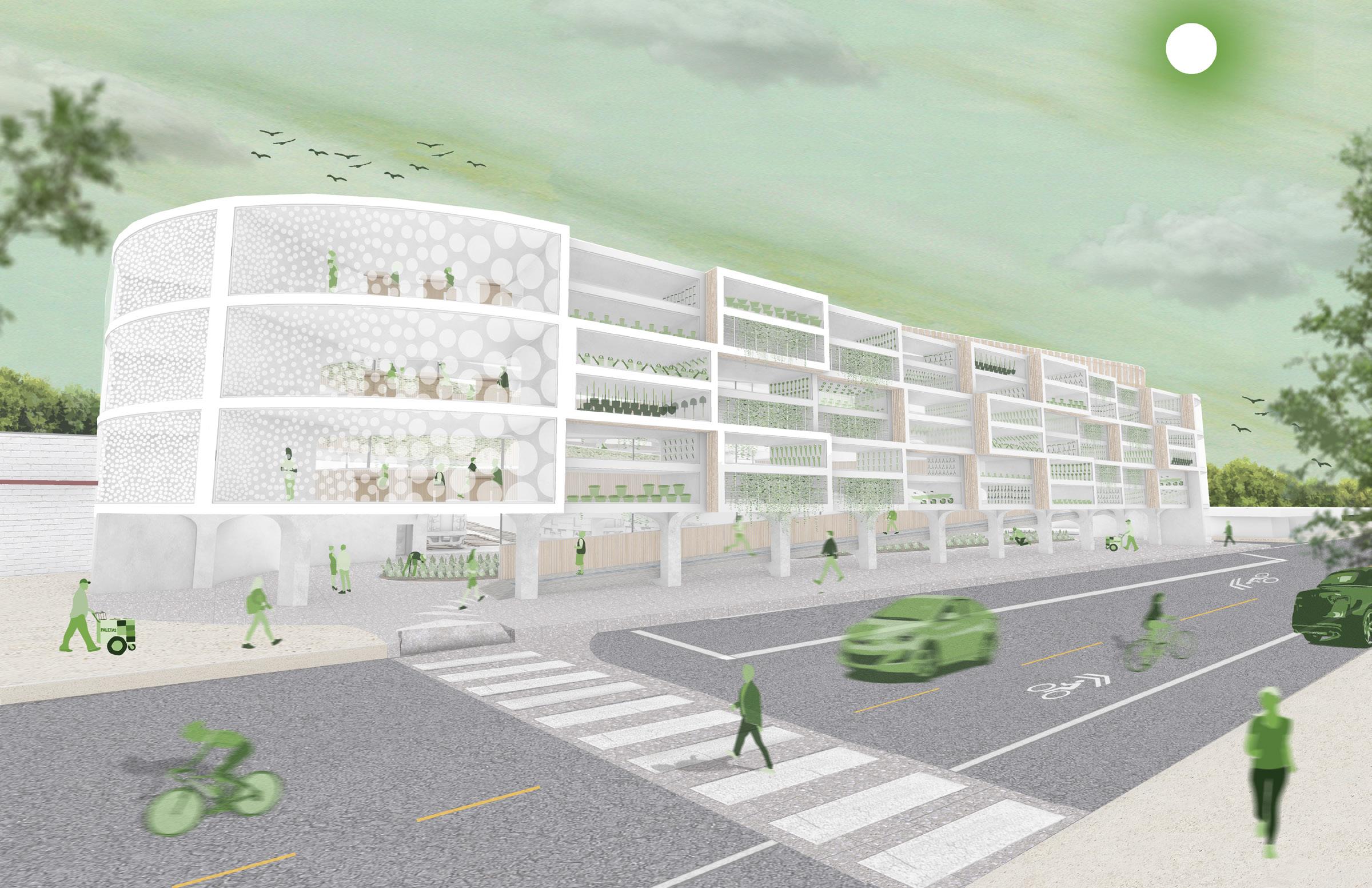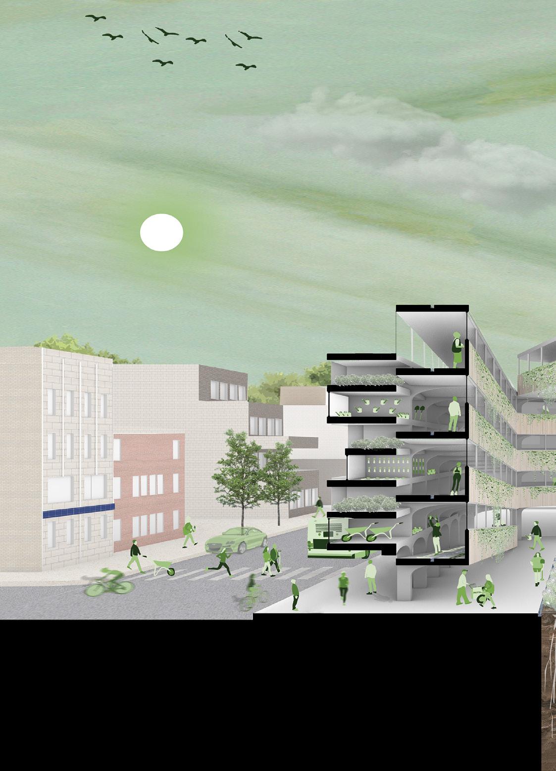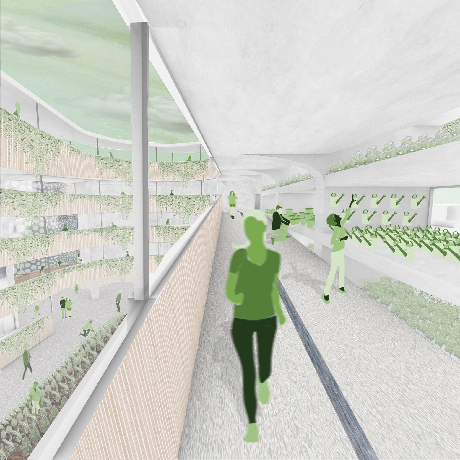 Cultivating Connectivity is a social infrastructure for Albany Park that generates a new typology of civic space centered on well-being activities such as gardening and fitness. A continuous, helical track wraps around a central open-air community garden, offering visitors an adventurous running or walking experience alongside panoramic views. The inclinced track reaches out toward the street, beckoning community members inside while compartments arrayed along its perimeter provide storage for a loanable inventory of garden tools, populating the building’s facade with a dynamic flux of content. With opportunities to attract neighbors with different interests and motivations. Cultivating Connectivity makes space for building new, intersectional relationships.