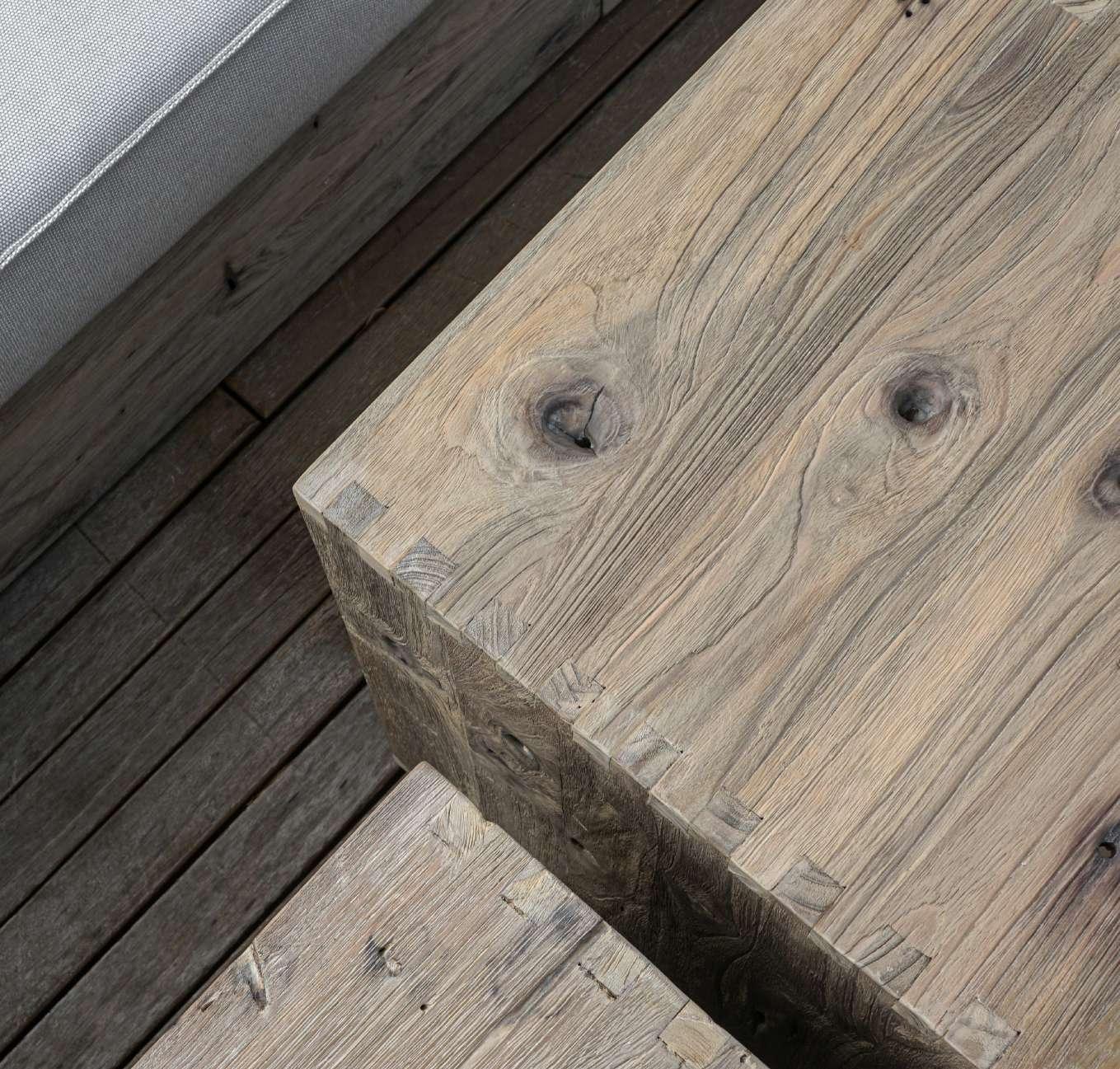 MAMAGREEN drift-look teak is showcasing both natural and handmade distress marks. This ‘extra-distressed’, recycled teak is then finished, either ‘as original’, or in rich espresso. Highly contemporary, texture-rich Drift-look teak is used in our iconic AIKO Collection.