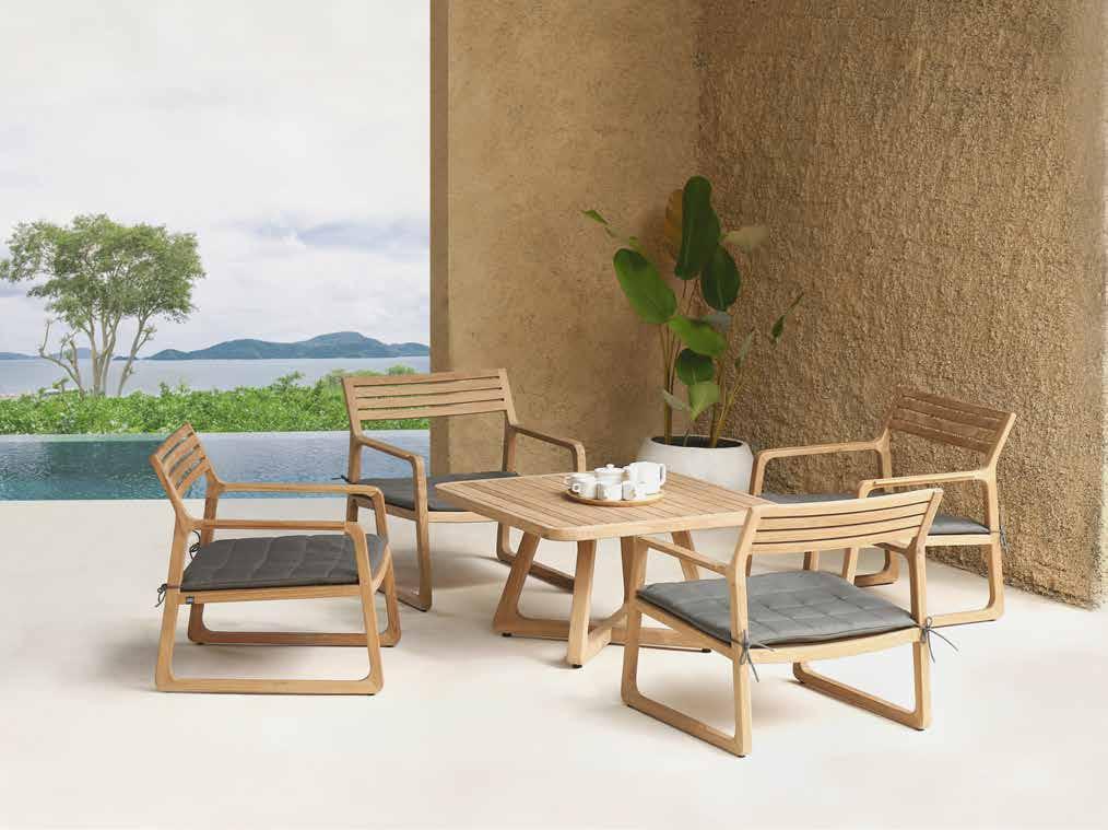 For a more conventional family size we offer also a rectangular dining table. Bar, counter and low tables come in various dimensions. Estate tables come with an HPL inlay option for added color variations. Premium quality teak is only harvested from sustainable farms.