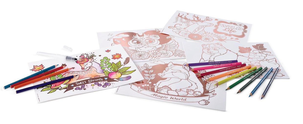 • Metallic paintings to colour and paint over with a brush for a unique “watercolour effect”!