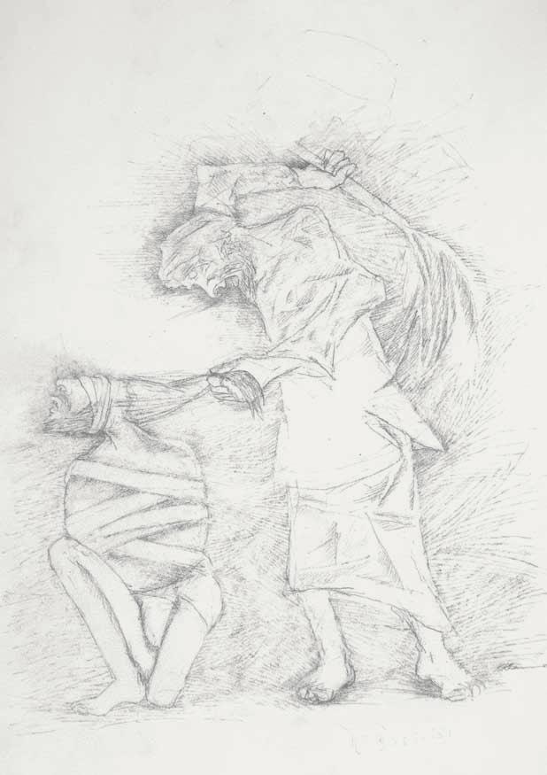 motif, together with that central hand pulling so viciously at Christ’s hair. Khanna has witnessed or known of, over the decades, many fellow humans suffering at the hands of officials acting on the orders of superior powers.