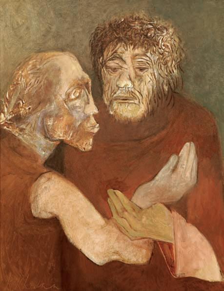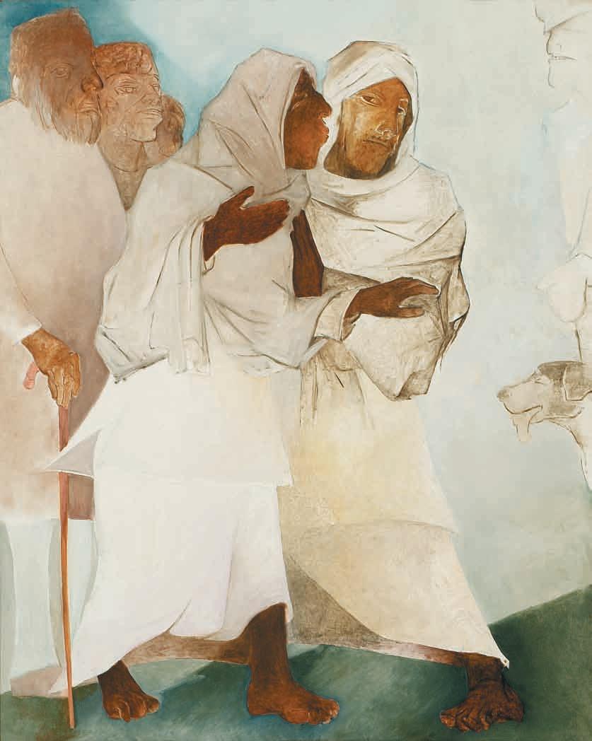 Flagellation stands for all such acts of violence, often for political reasons but supposedly in the name of law and order. Betrayals are often part of such stories, and in another canvas of the same years, also five by four feet, we see Judas betraying Christ with a kiss. This is another very succinct image, with the two protagonists supported by only two indistinct figures indicated on the left and the snout of a dog on the right. Judas’s hands gesture and reach out to Christ as his lips press forward; with his left hand (we do not see his right) Christ gently, almost apologetically wards off Judas’s lying approach, while his left foot stands forward to strengthen that patient gesture. Each of these powerful paintings delivers an emblem, succinctly scored and choreographed. The main figures, large on the canvas, feel