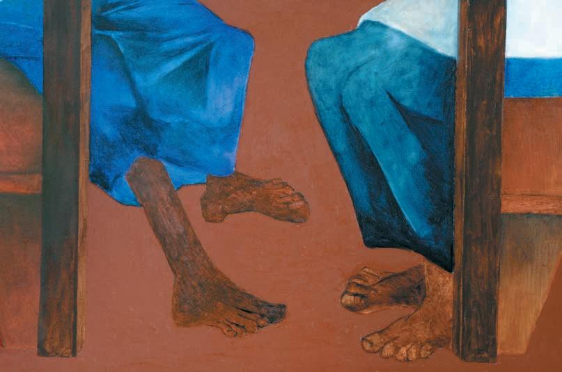 barely contained by the rectangular supports. Once seen, they are not easily forgotten: they burn their way into our store of significant images. The lack of ameliorating colours and expressive brushwork, the lack of all sweetening or distraction from the key performance, gives this art an incisive and enduring character that goes far beyond the photo-based representations that are often promoted as contemporary art with a social purpose. Technically, these are narrative scenes, qualifying, in view of the importance and the familiarity of their subjects, for the art historical term ‘history painting’. Through centuries from the Renaissance on, history painting attracted ambitious artists and held the attention of their informed public, while portraits and genre scenes, of daily life as lived by anonymous contemporaries, were accorded much less attention and an inferior status. At different times and in different places history paintings could be overloaded with narrative or sensuously attractive detail, or honed down to essentials in order to produce a noble – not an entertaining – image. In concentrating his narrative so firmly, Khanna also de-particularizes it. Consider, for contrast, Giotto’s crowded and dramatic fresco of the Kiss of Judas in Padua or Piero’s panel of the Flagellation in
