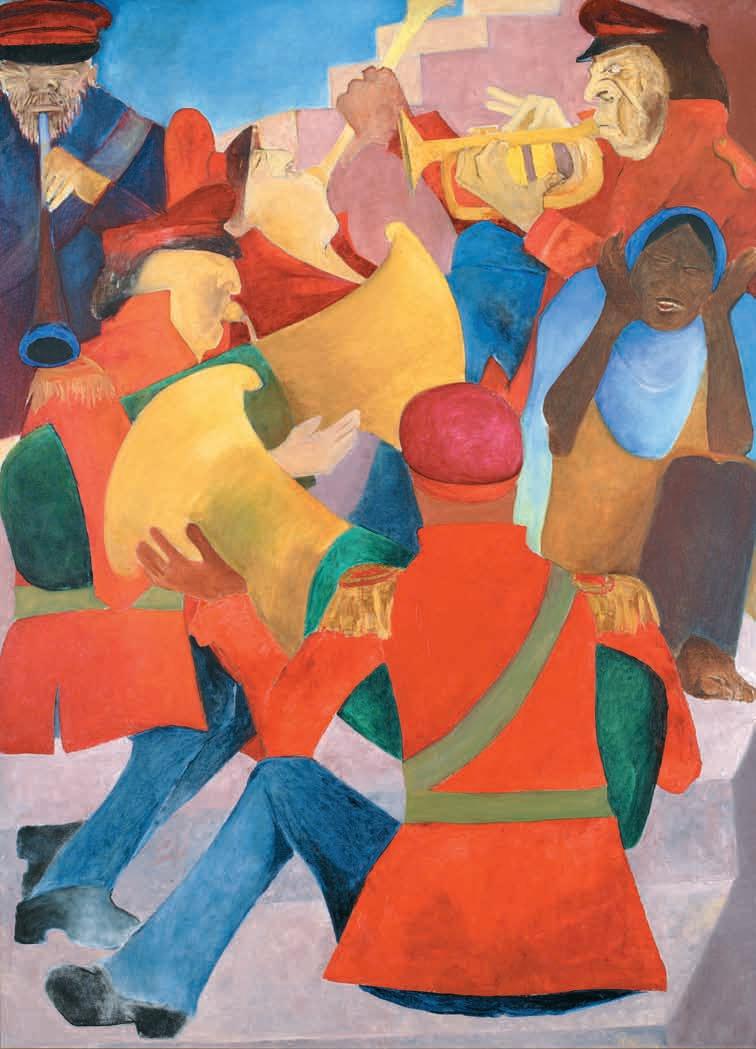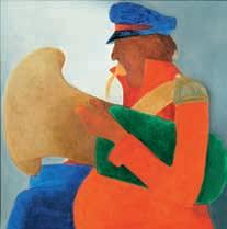 As with the other genre paintings in Krishen Khanna’s oeuvre, the genesis of the Bandwallah paintings is rooted in personal experience. While driving out of the Garhi Studios one day, in the early 1970s his car was held up by a passing band. Against the background of the 18th-century Garhi fort with its large, capacious artist studios, the raucous band crammed into the small mean street of Garhi village. The syncopated tunes intended for the jollification of a baraat (wedding party), the quotient of assertive maleness and vigour of the accompanying groom’s party, the residual image of the British colonial march past, and sanguine military energy collapsed into a singular image on that warm Delhi afternoon. Positioning himself as sympathetic spectator and a somewhat humorous narrator, Krishen Khanna has steadily painted the bandwallah; the heroics of the street have been rendered with a deep humanist sympathy. Krishen Khanna’s engagement with music and musicians as a subject has been a steady preoccupation. In the 1950s, his home in Madras was