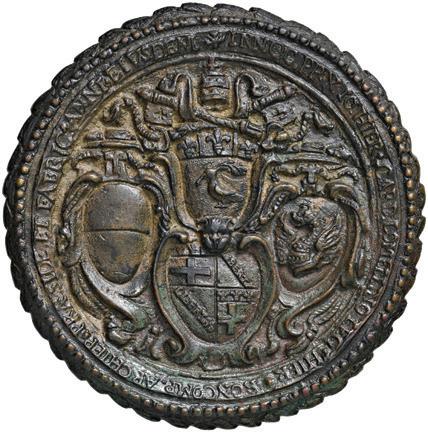488 San Petronio, Patrono di Bologna (IV secolo) Rarissima medaglia di massimo modulo da fusione 1653 Costruzione dell’Abside nella Basilica di San Petronio in Bologna; sotto Innocenzo X, i quattro stemmi: Innocenzo XI, Bologna, Cardinale Lomellini e Arcivescovo Boncompagni - Opus: Camillo Mazza - Miselli 484 - AE (g 593 - Ø 115 mm) Medaglia estremamente rara, prodotta da fusione con bordo tutto lavorato a foglie.