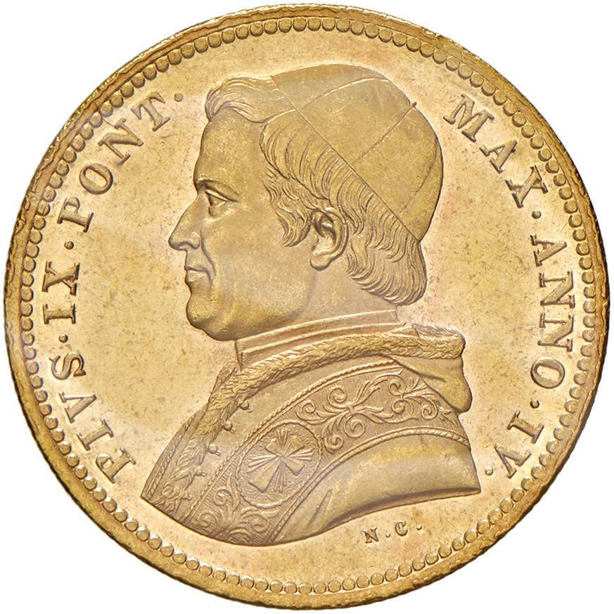 487 Leone XIII (1878-1903) Medaglia 1882 A.V – Opus: Bianchi – AU (g 53,03 - 43 mm) In slab NGC MS 62 DPL cod. 6634185-005. Medaglia di rarissima apparizione. Con bellissimo astuccio d’epoca in velluto bordeaux con stemma papale. Nell’asta Varesi dal 2021 un esemplare dichiarato qFDC ha realizzato 9.500 euro più diritti. MS 62 DPL 4.000