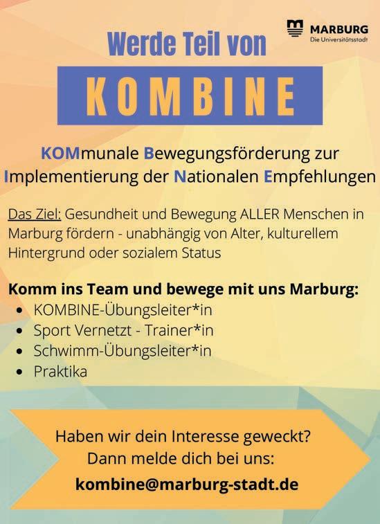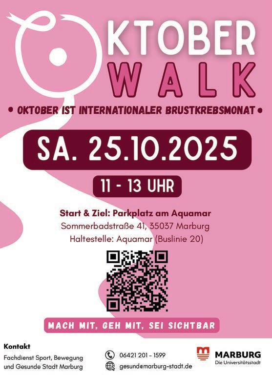 l WENDO-Selbstbehauptung, Selbstverteidigung und Gewaltprävention für Frauen, mehrwöchiger Kurs vom 29. Oktober - 10. Dezember 2025 (immer mittwochs 20:1521:45 Uhr). Weitere Informationen und Anmeldung bei: Wendo Marburg e.V., Tel. 06421-8891609, info@wendo-marburg.de oder www. wendo-marburg.de (gewerbl.)