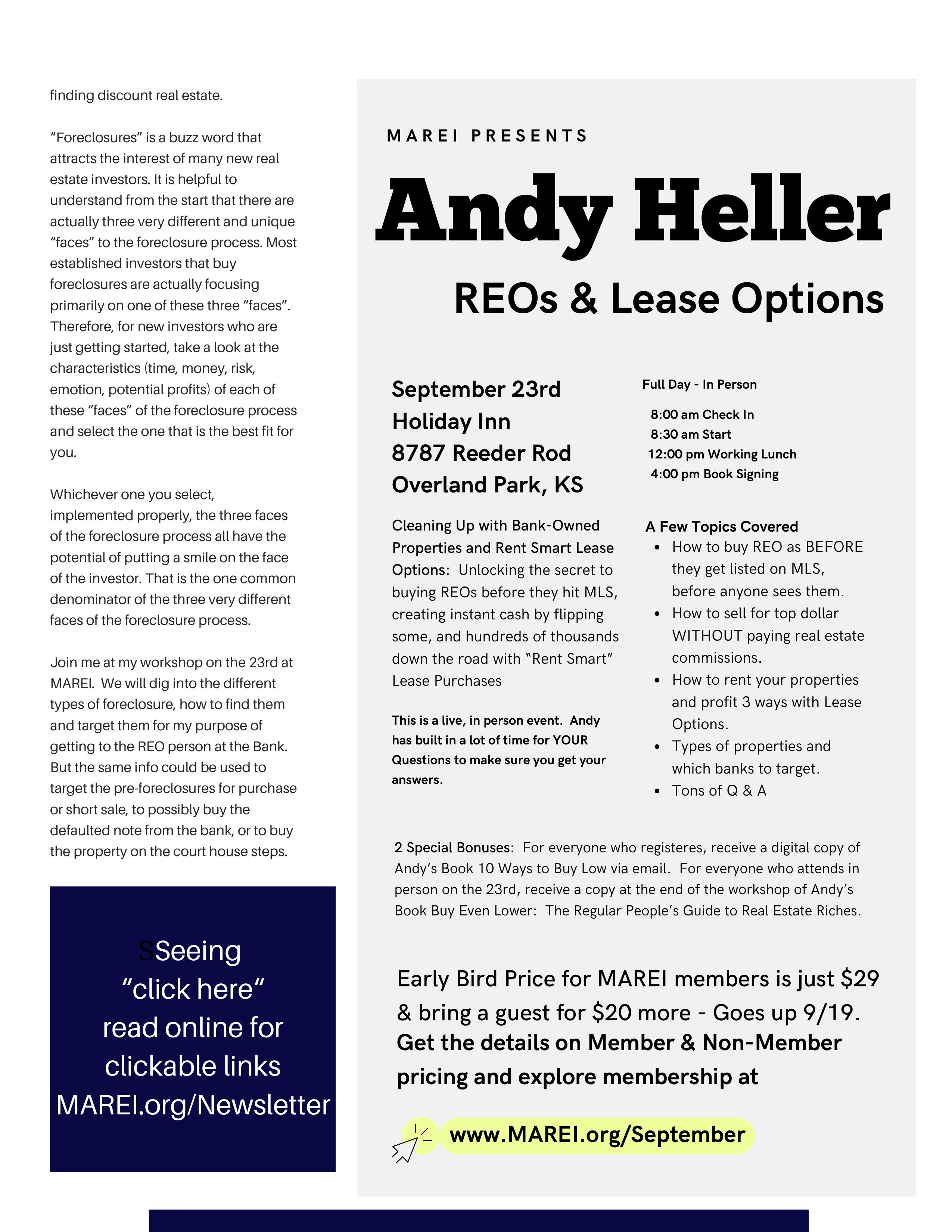 In this month's issue MAREI Calendar of Events, The 3 Faces of Foreclosure, the Andy Heller Workshop, MAREI's New Meeting Location, New MAREI Online Master Intensive Classes, New Express Success, New Memberships & Membership Pricing, Market Update, Buy and Hold Deal Eval - Notes from Andrew Syrios, Have you claimed your Google My Business Profile, the MAREI Business Directory, & Photos from Last Months Meeting.