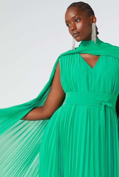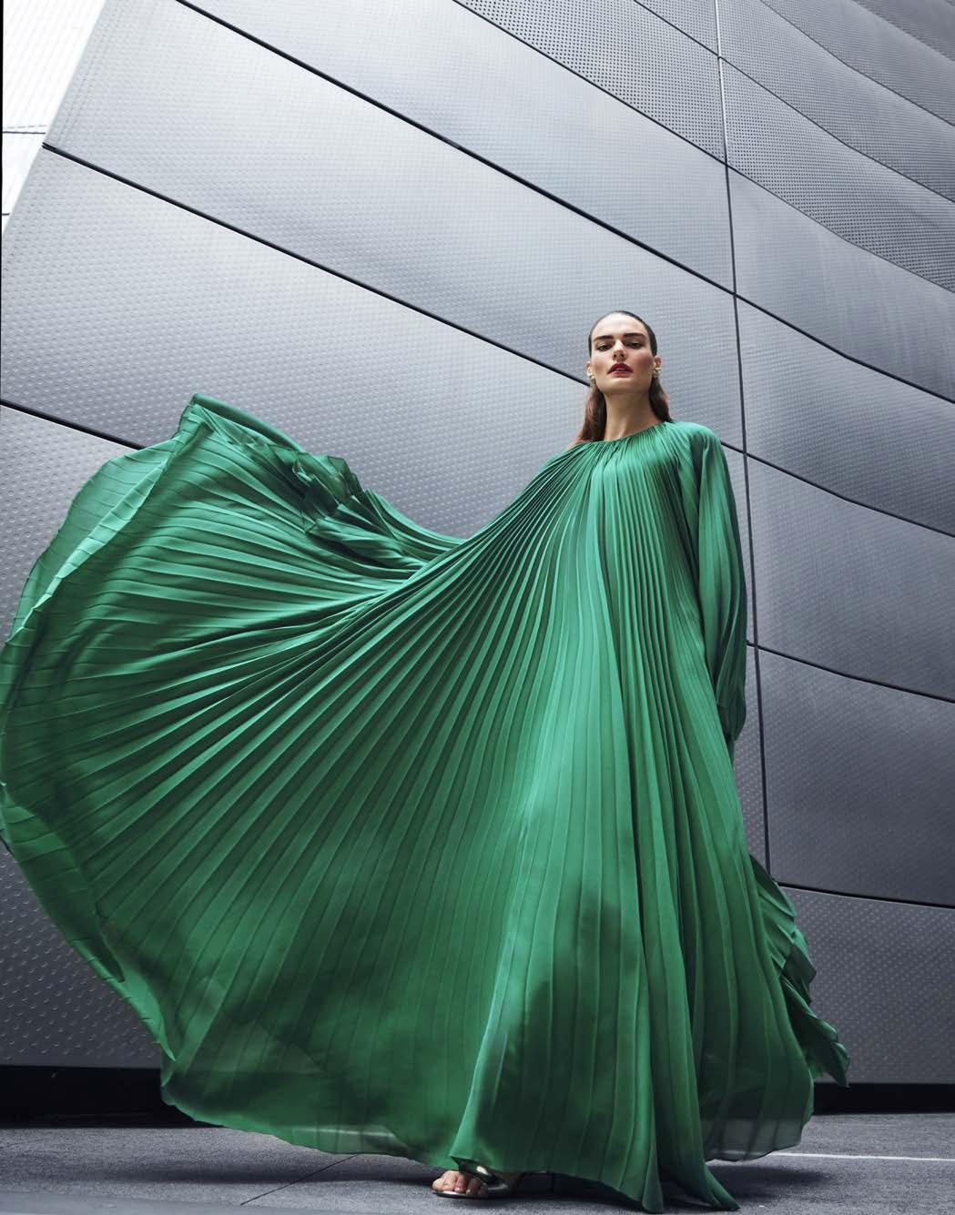 Plissierte Tuniken und Maxikleider eignen sich bestens für diese Anlässe. Entschärfe den klassischen Schnitt, indem du dich für leuchtende Farben und lebhafte Muster entscheidest, die dem Look eine gewisse Sinnlichkeit verleihen.