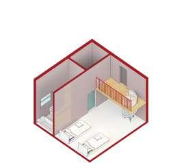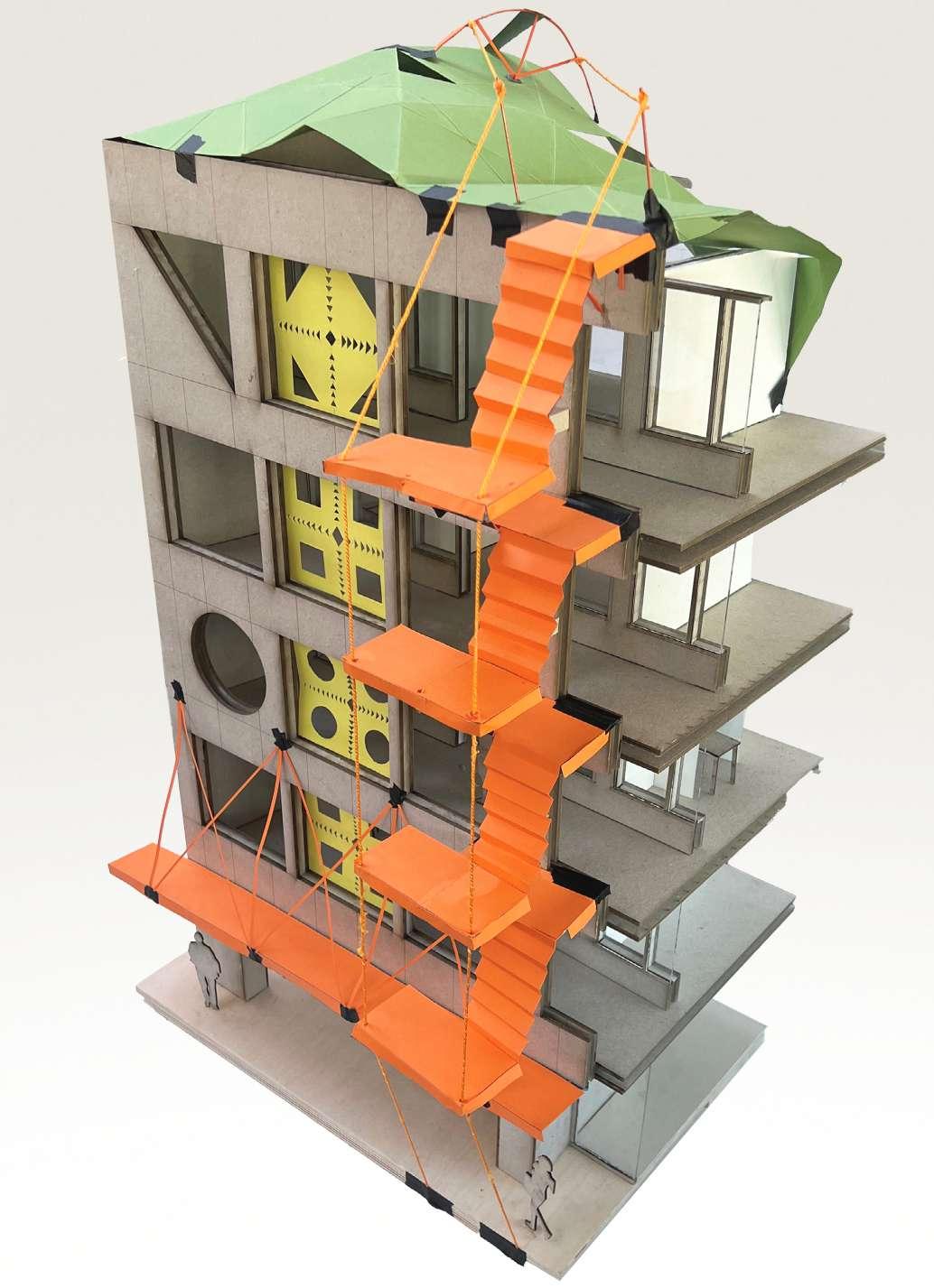 The prototype design drew inspiration from the Unité d’Habitation, incorporating small apartment sizes similar to the BSH project. The interlocked maisonettes create close bonds between two communities. The lightweight structure extends to accommodate work and social spaces.