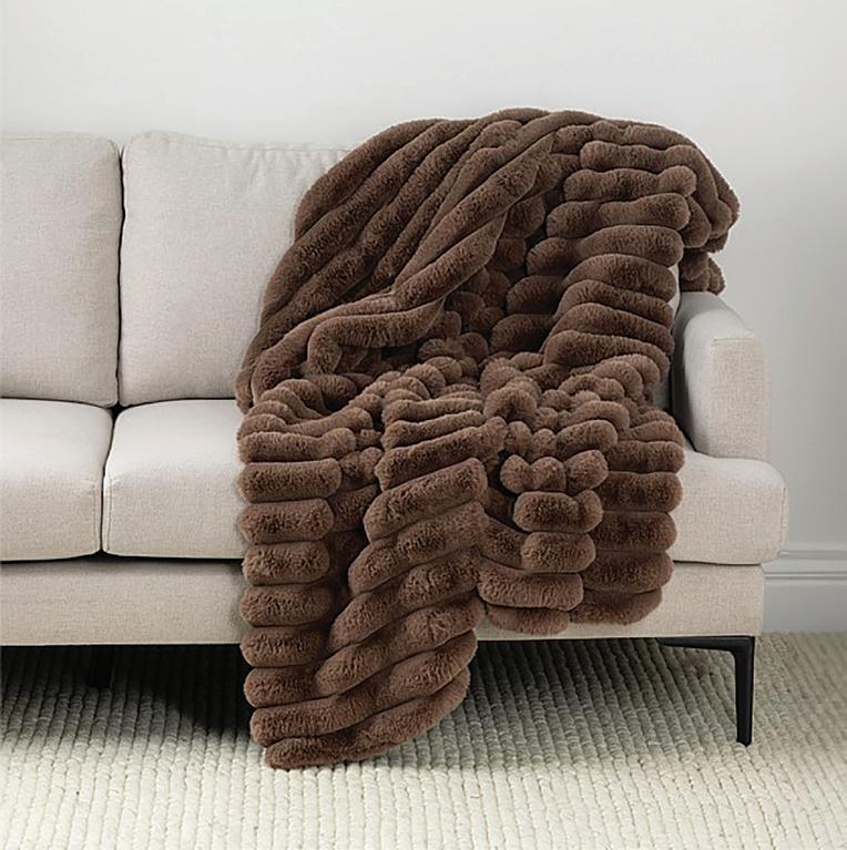 Elevate your interior design with the luxurious Sophia Ribbed Faux Fur Throw in chocolate brown. This cosy blanket is the perfect accent piece to add a touch of elegance and warmth to your living room.