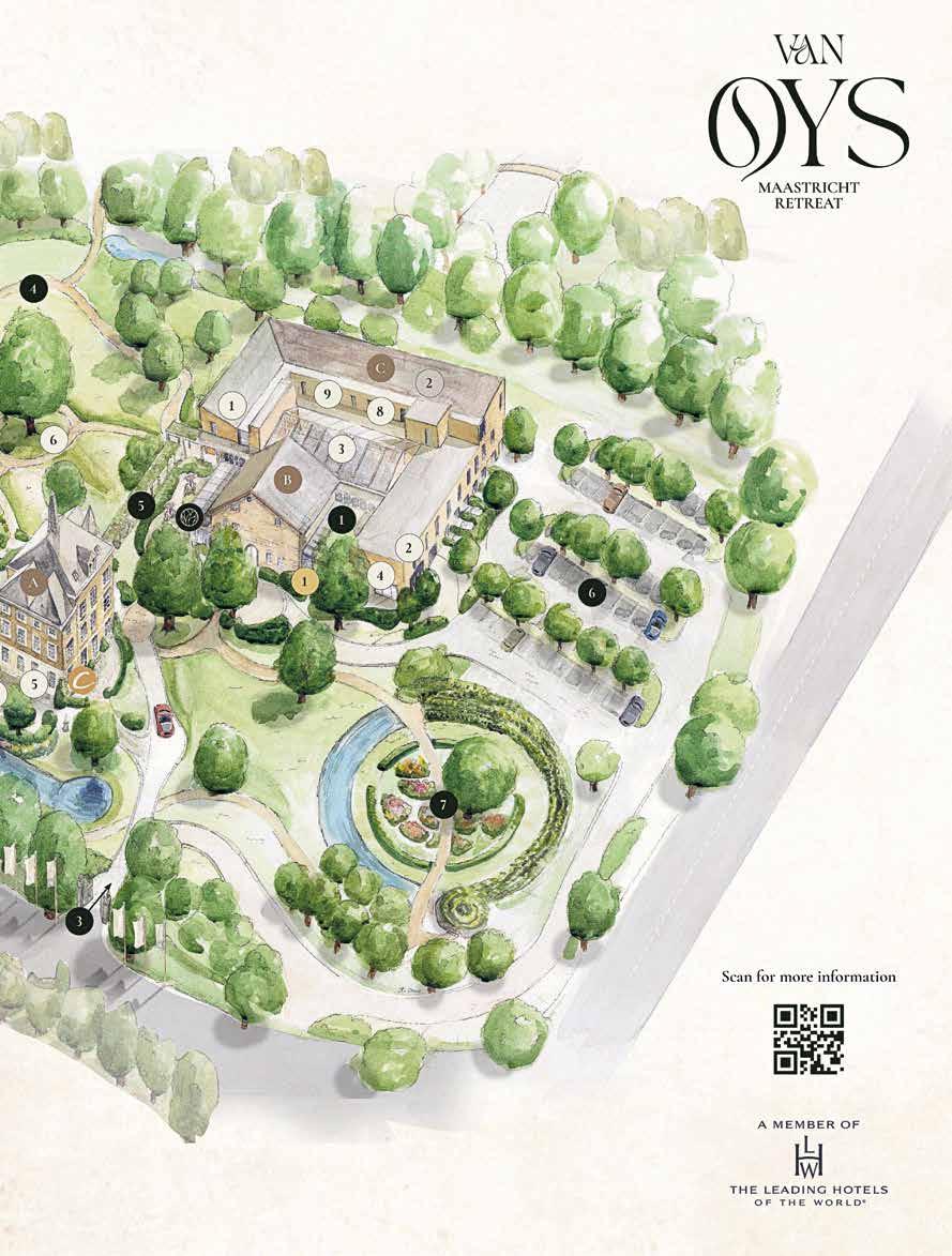 Maastricht Retreat – a thoroughly modern sanctuary shaped by its past, but looking firmly to the future. The contrast between ancient heritage and contemporary luxury is striking. And yet, throughout the entire estate, the connection to the landscape and the legacy of this place remains ever present. The restoration has been carried out with great care and respect, preserving the spirit of the past while creating something new – a fivestar superior hotel and proud member of the Leading Hotels of the World. Together, these distinctions give Van Oys a truly unique place in the hospitality world. Perfectly located at the heart of Europe, Van Oys is just an hour from the international airports of Eindhoven, Brussels, Düsseldorf and Cologne. The centre of Maastricht – a city with Roman roots and a global reputation – is only minutes away. Known for the Maastricht Treaty of 1992, which laid the foundations of the European Union, the city is also home to world-famous events like TEFAF and the André Rieu open-air concerts. Still, the real charm of Van Oys lies in the experience it offers. Surrounded by green hills and peaceful countryside,