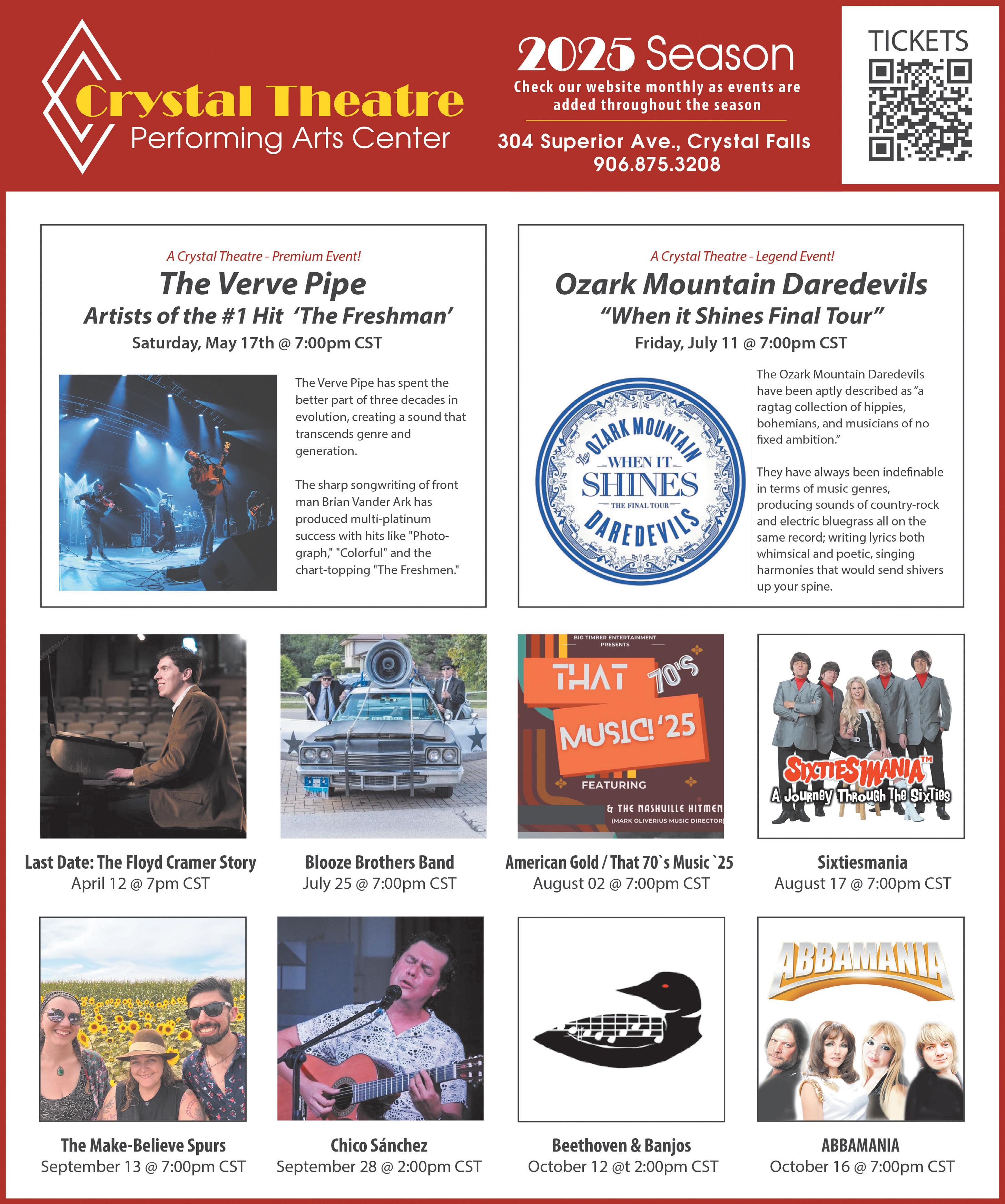 • Great Lakes Poetry Festival Afterglow Event. The 2025 Great Lakes Poetry Festival will close with readings by Gala Malherbe, Ronnie Ferguson, Troy Graham and two-time U.P. Poet Laureate Marty Achatz. Troy Graham will round out the evening with a concert. 5 to 8 p.m. Rippling River Resort, 4321 M-553. 906-2264322 or pwpl.info.