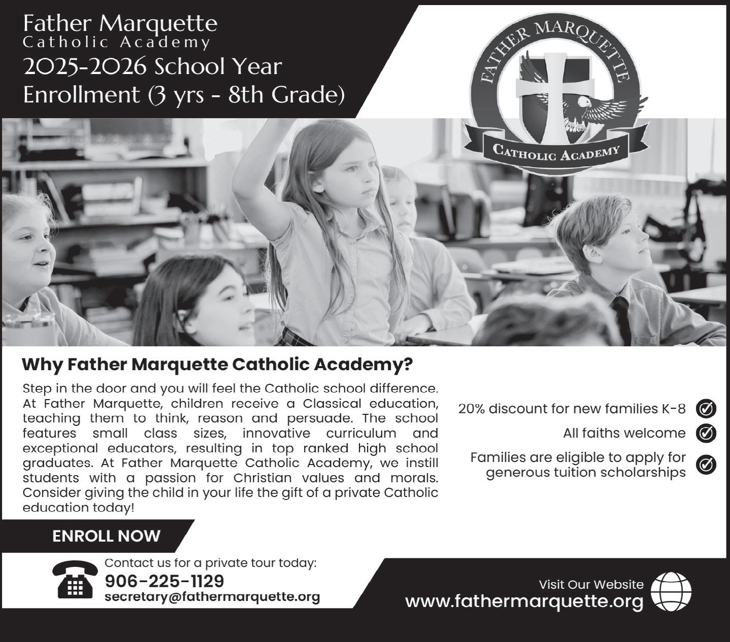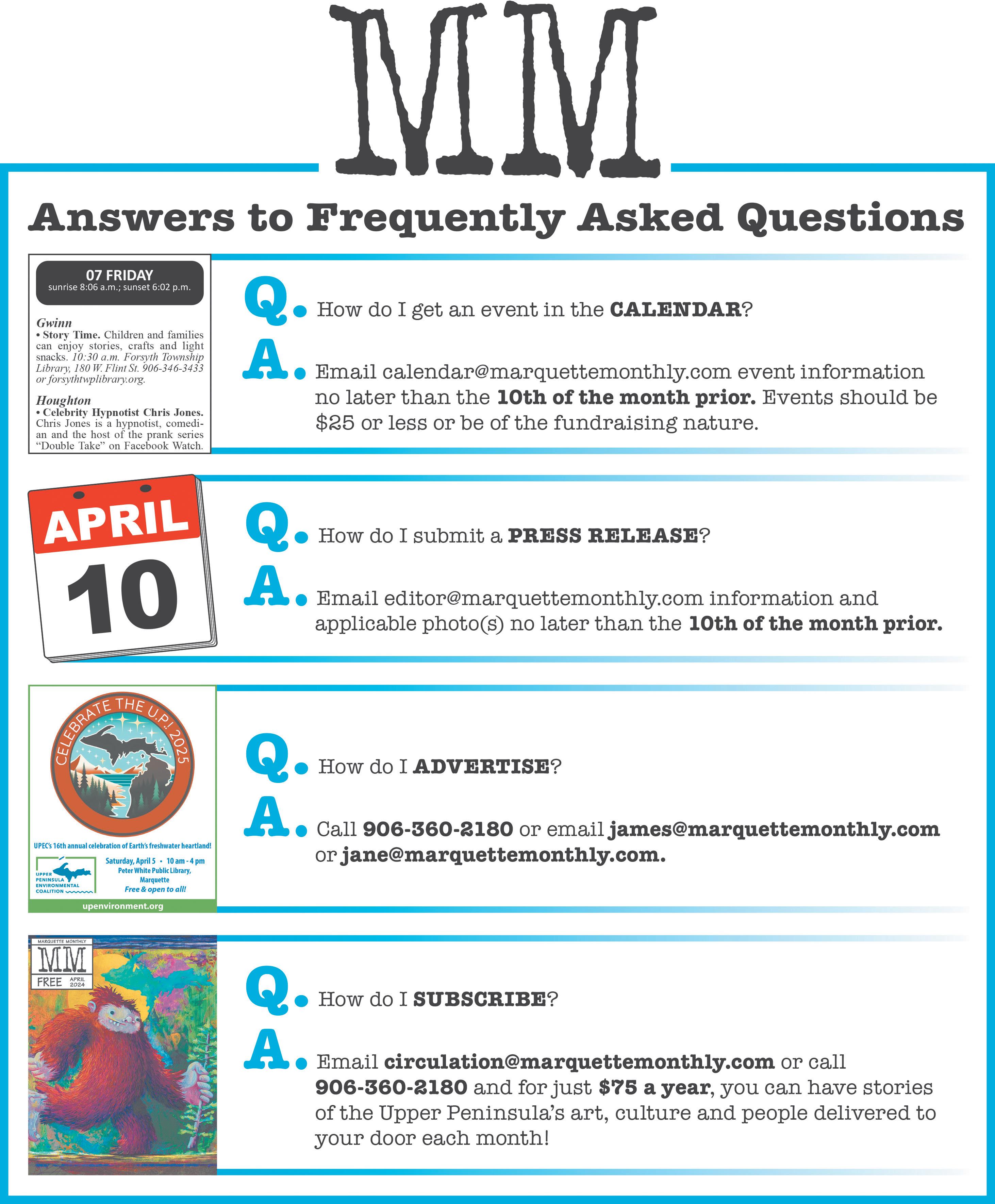 Marquette Monthly, published by Model Town Publishing, LLC, located at PO Box 109, Gwinn, MI, 49841, is locally and independently owned. Entire contents Copyright 2025 by Model Town Publishing. All rights reserved. Permission or use of editorial material in any manner must be obtained in writing from the publishers. Marquette Monthly is published 12 times a year. Subscriptions are $75 per year. Freelance material can be submitted for consideration to editor@marquettemonthly.com. Events can be submitted to calendar@marquettemonthly.com. Ad inquiries can be sent to james@marquettemonthly.com or jane@marquettemonthly.com.