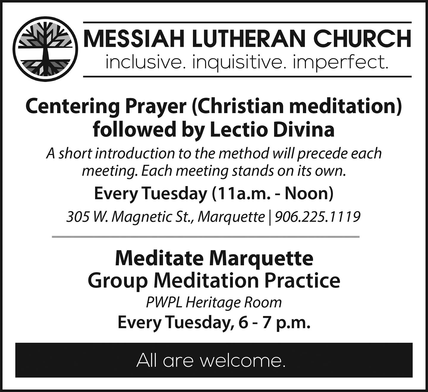 • Cultivating Care, Compassion and Connection. This event will offer a safe space to pause, reflect and build connections with others who are committed to cultivating kindness. Each week, a different local organization will present educators and leaders who will facilitate a discussion while maintaining a shared commitment to the Charter for Compassion and the Circle of Trust principles. Noon. Heritage Room, Peter White Public Library, 217 N. Front St. 906-226-4303.