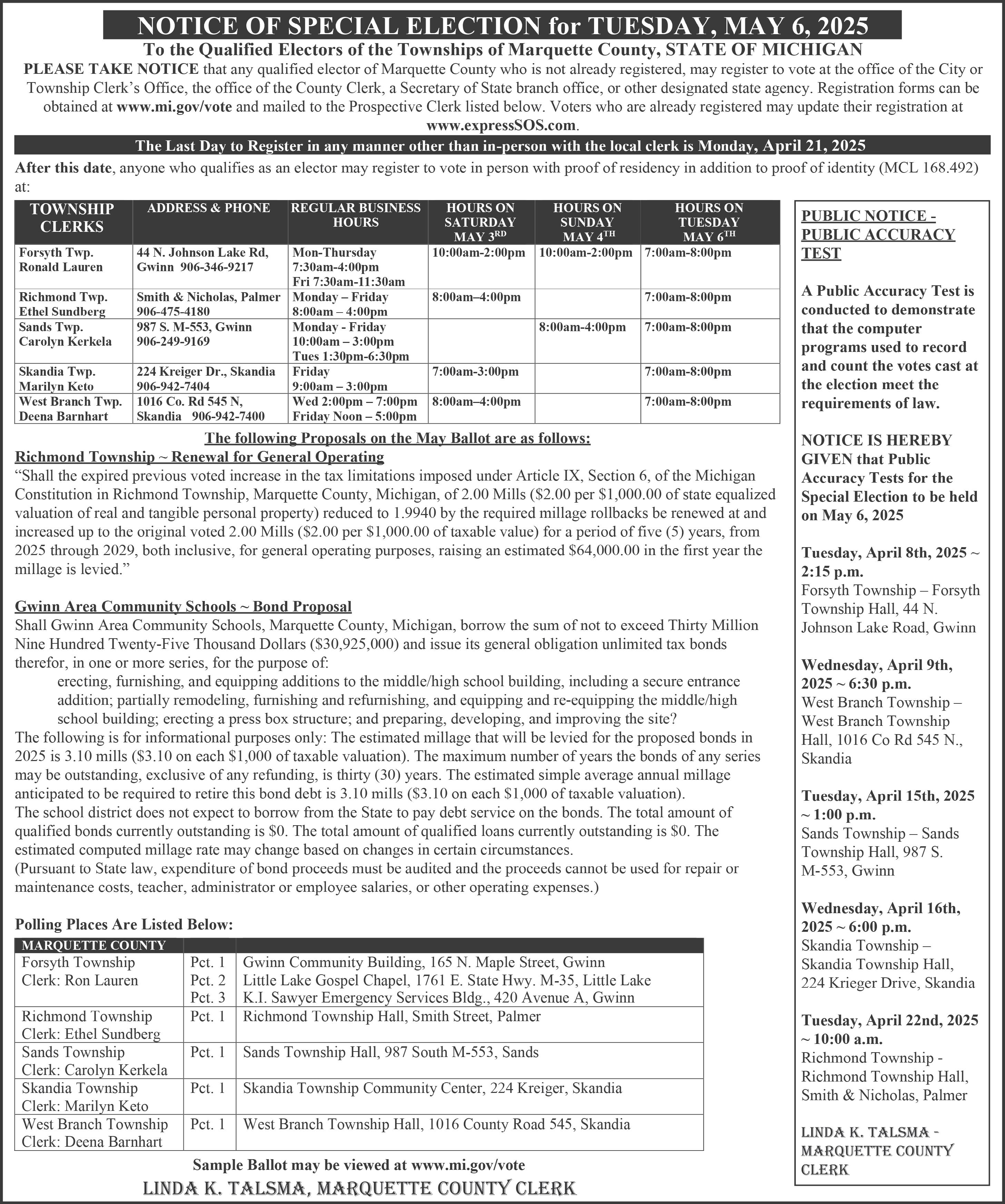 For information, call 906-235-8478 or email billirving2003@yahoo.com.