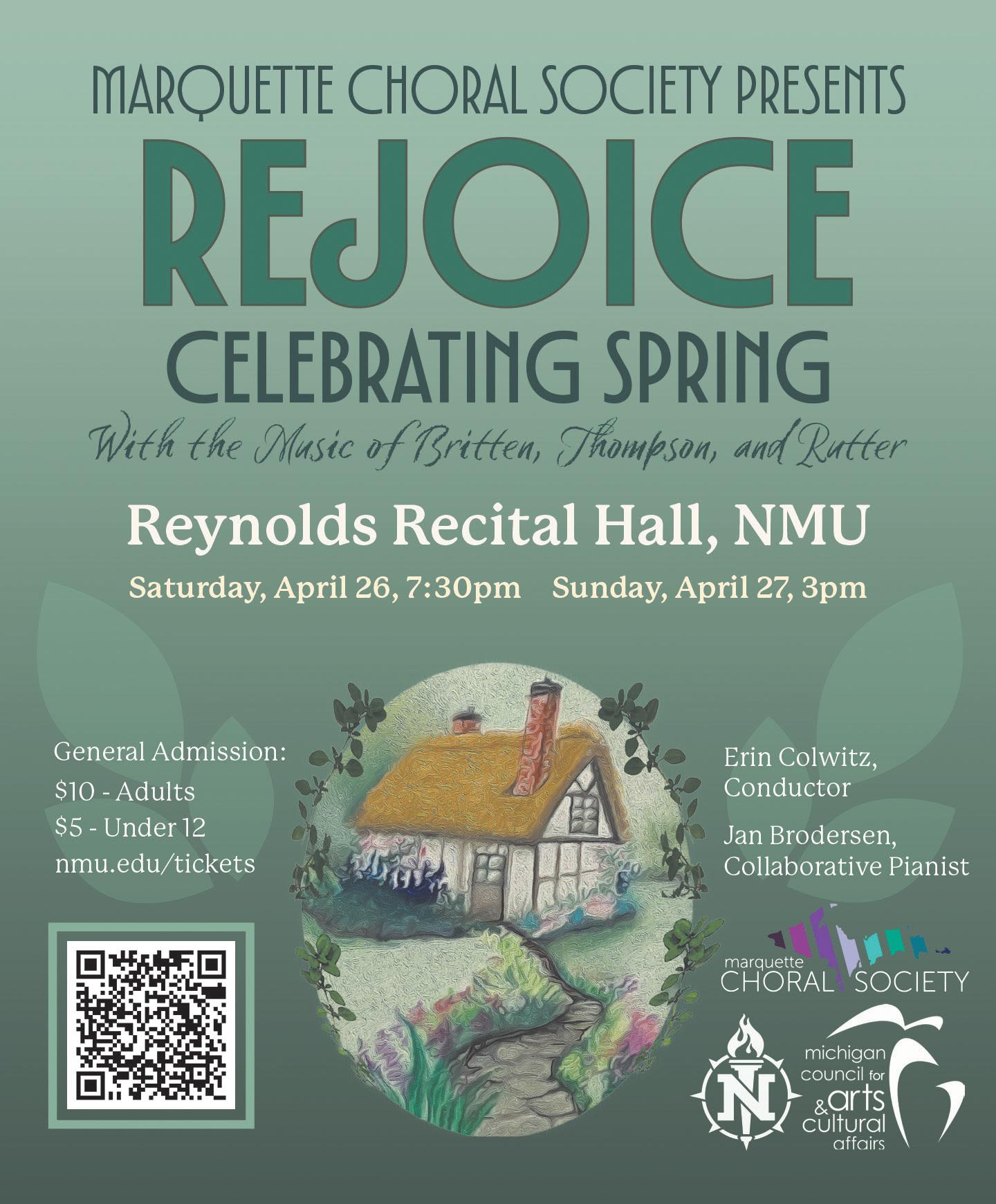 • Marquette Choral Society Spring Concert. The concert will feature Benjamin Britten’s “Rejoice in the Lamb,” Randall Thompson’s “Frostiana” based on the poetry of Robert Frost, and John Rutter’s “The Sprig of Thyme.” The Upper Peninsula Choral Leadership Award will also be presented. Children younger than 12, $5; adults, $10. 3 p.m. Reynolds Recital Hall, NMU. nmu.edu/tickets.