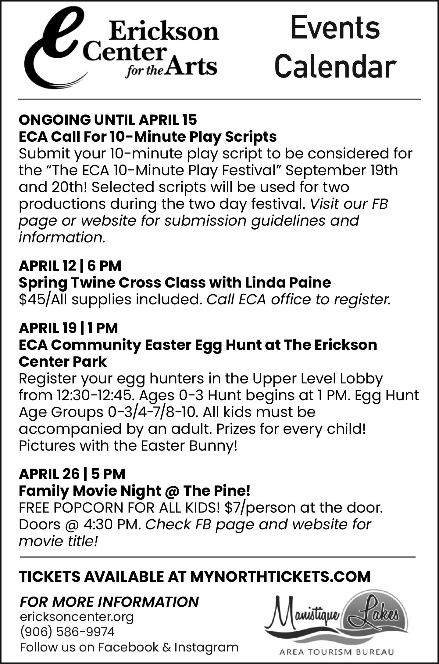 • Family Movie Night. The movie title is TBA. There will be free popcorn for all kids. $7. 5 p.m. The Pine Performance Center, N9224 Saw-Wa-Quato St. 906-586-9974 or ericksoncenter.org.