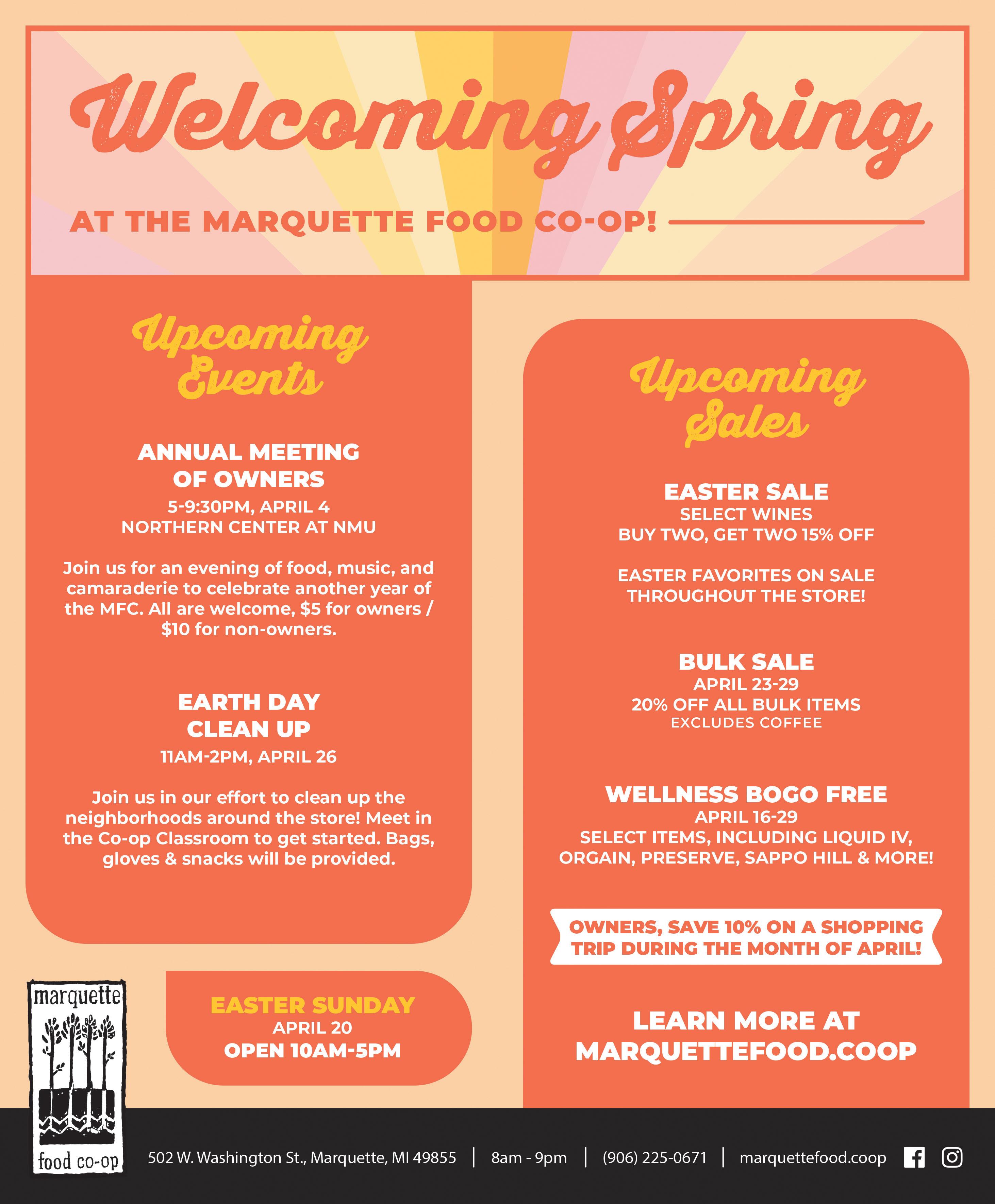 The Marquette Food Co-Op will host an outdoor cleanup event at 11 a.m. on April 26. Volunteers are welcome, and there will be educational stations inside the store.