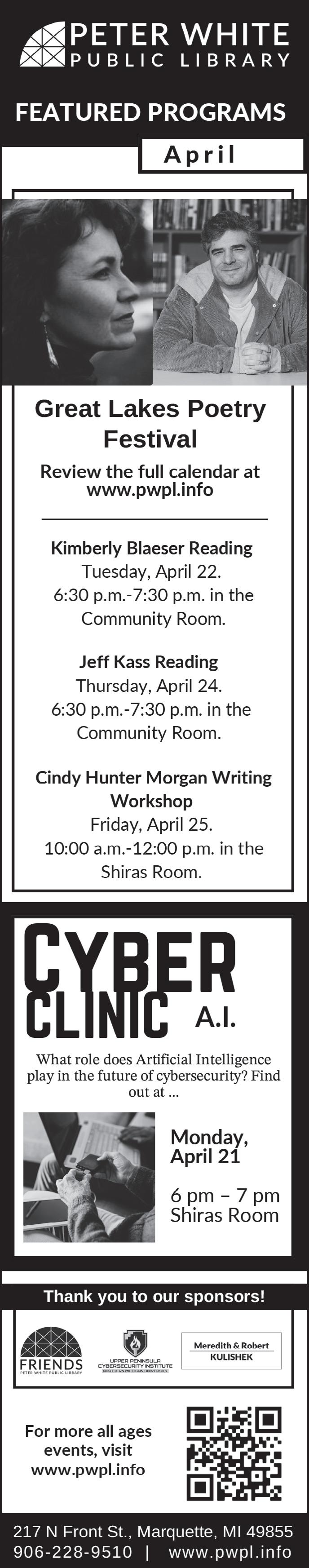 • Great Lakes Poetry Festival: 2025 International 3-Day Chapbook Contest Reading and Award Ceremony. The three winners of the 2024 3-Day International Chapbook Competition will read from their work. The contest was judged by award-winning poet Diane Glancy. 1 p.m. Community Room, Peter White Public Library, 217 N. Front St. 906226-4322 or pwpl.info.
