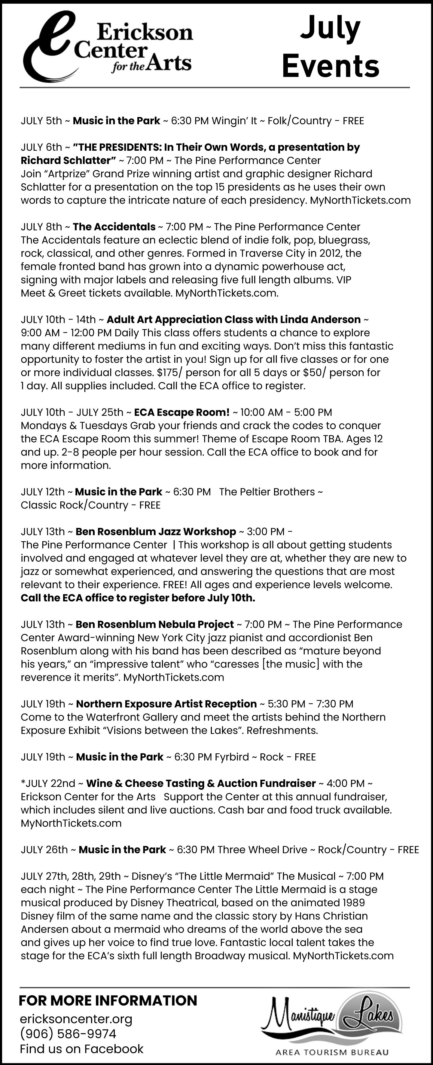 • Music in the Park. Three Wheel Drive will perform. 6:30 p.m. Erickson