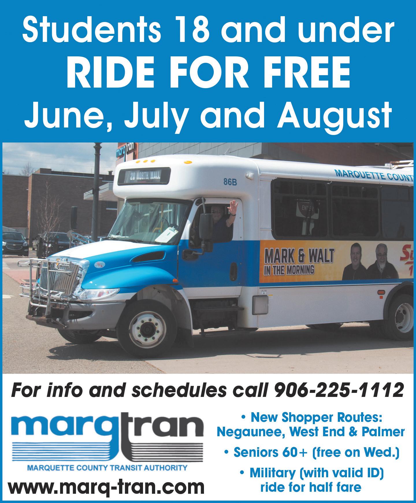• Historic Marquette Bus Tours. This 90-minute tour will present local history through stories told by historical reenactors. $25. 6 p.m. Depart from the Marquette Regional History Center, 145 W. Spring St. (906) 226-3571 or marquettehistory.org
