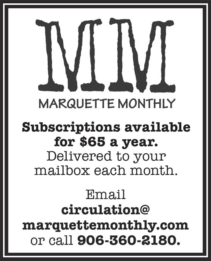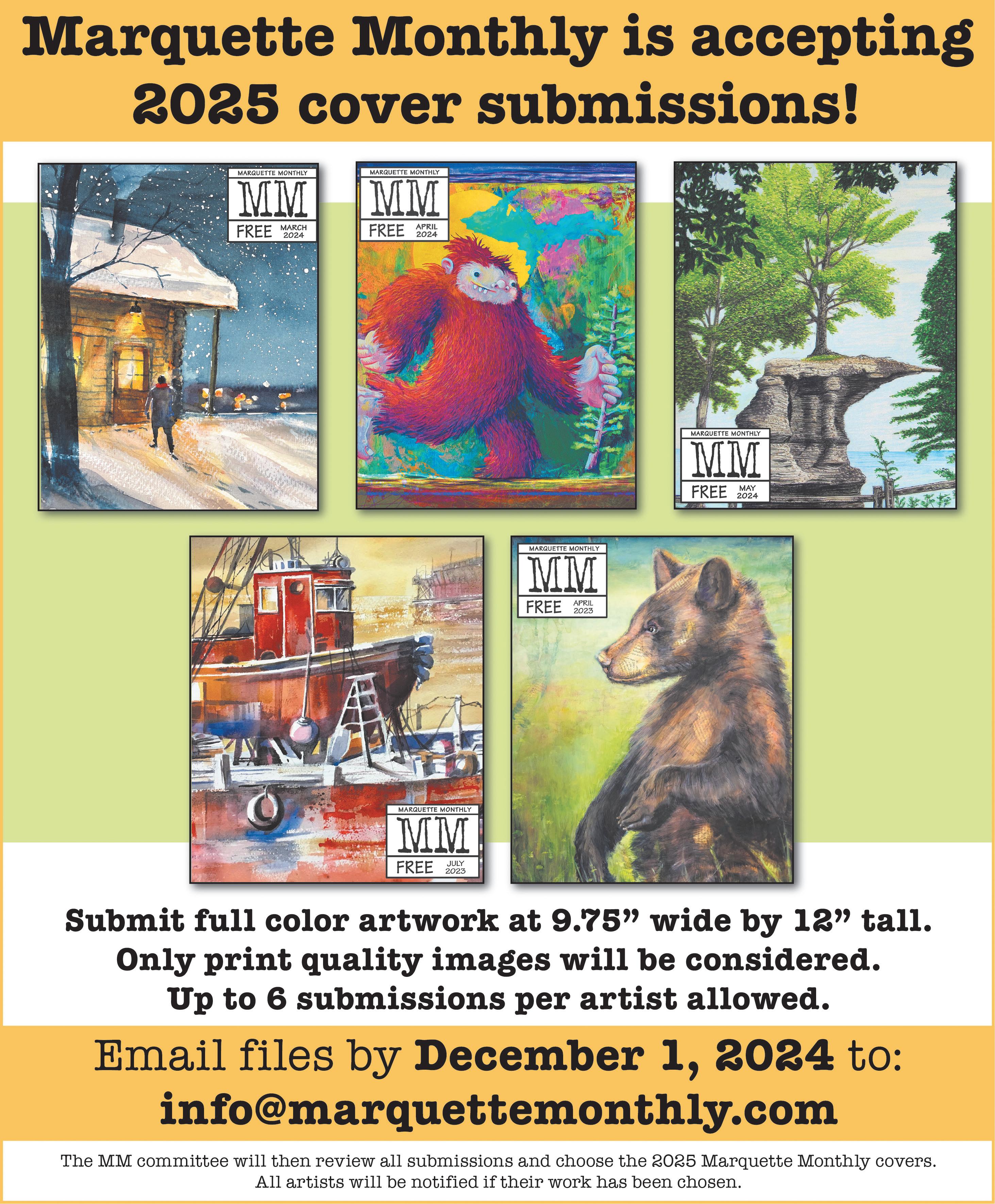 Marquette Monthly, published by Model Town Publishing, LLC, located at PO Box 109, Gwinn, MI, 49841, is locally and independently owned. Entire contents Copyright 2024 by Model Town Publishing. All rights reserved. Permission or use of editorial material in any manner must be obtained in writing from the publishers. Marquette Monthly is published 12 times a year. Subscriptions are $65 per year. Freelance material can be submitted for consideration to editor@marquettemonthly.com. Events can be submitted to calendar@marquettemonthly.com. Ad inquiries can be sent to james@marquettemonthly.com or jane@marquettemonthly.com.