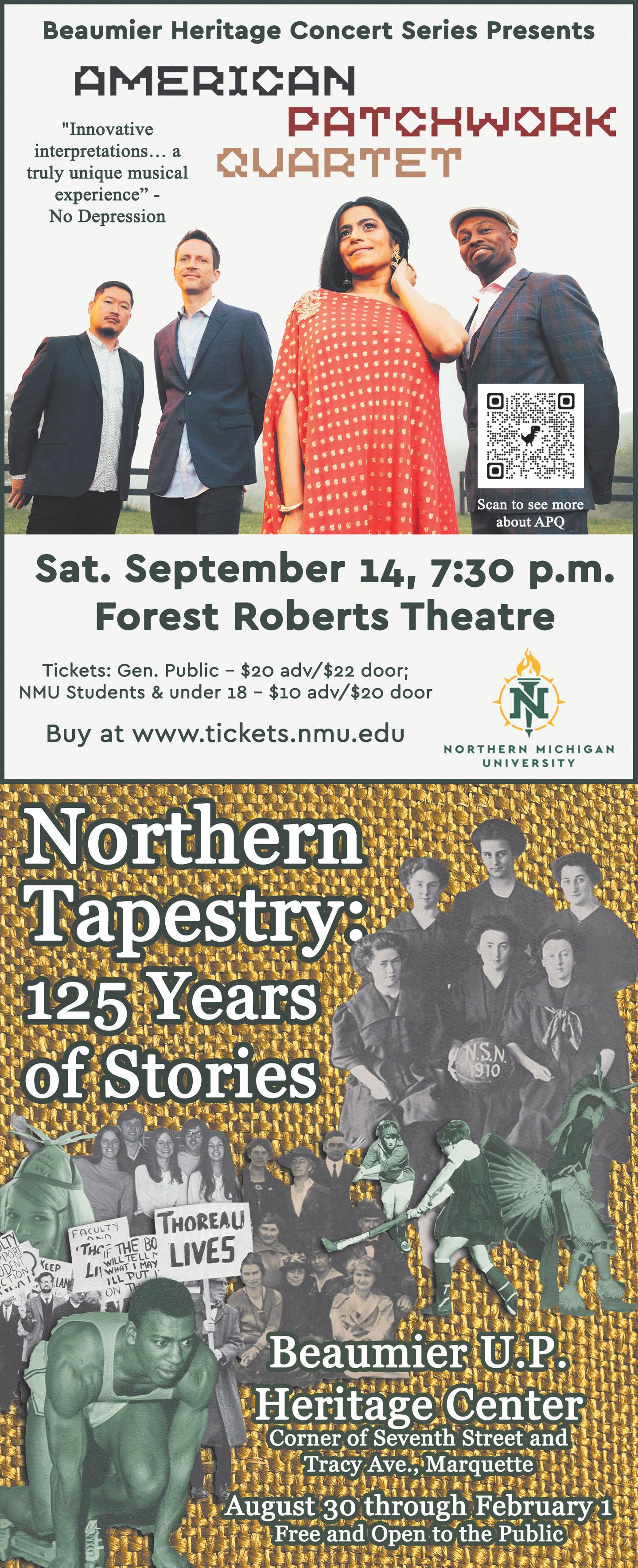 - Northern Tapestry: 125 Years of Stories, will be on display through Feb. 1, 2025. The museum promotes and preserves the history and culture of the U.P. and collects and preserves artifacts related to the history of NMU. Monday through Friday, 10 a.m. to 4 p.m.; Saturday, 11 to 4 p.m. Corner of Seventh and Tracy streets. NMU. 906-227-1219 or nmu.edu/beaumier.