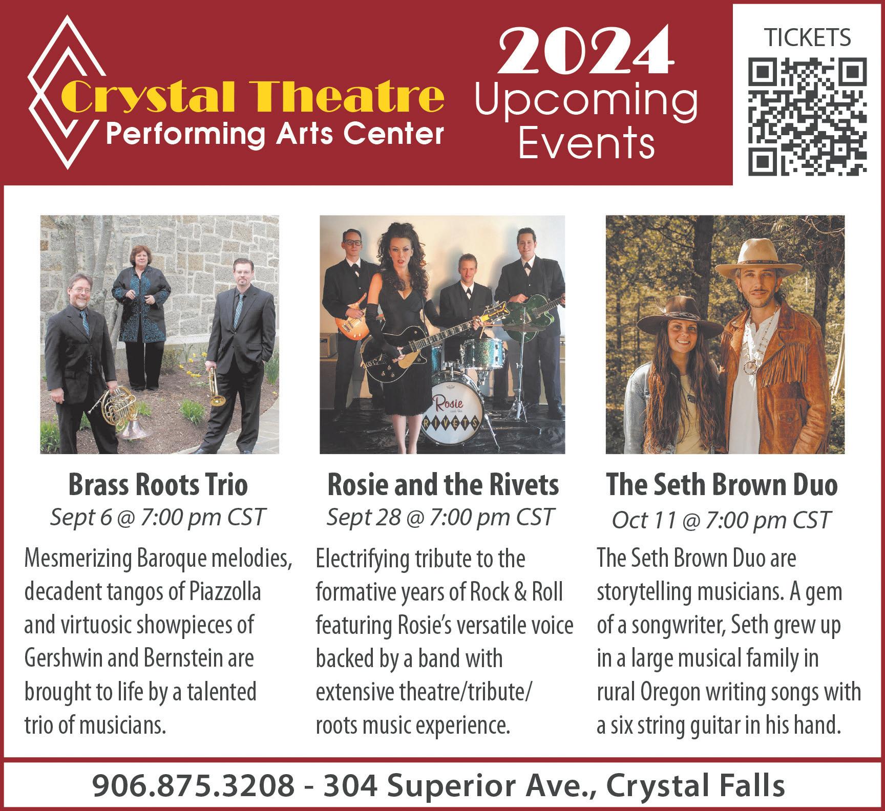 • Rosie and the Rivets. Rosie and the Rivets perform a female-fronted tribute to the formative years of rock ’n’ roll (1954-1964) as well as contemporary music with a retro twist. Students, $5; adults, $23. 7 p.m CDT. The Crystal Theatre, 304 Superior Ave. 906-875-3208 or thecrystaltheatre.org.