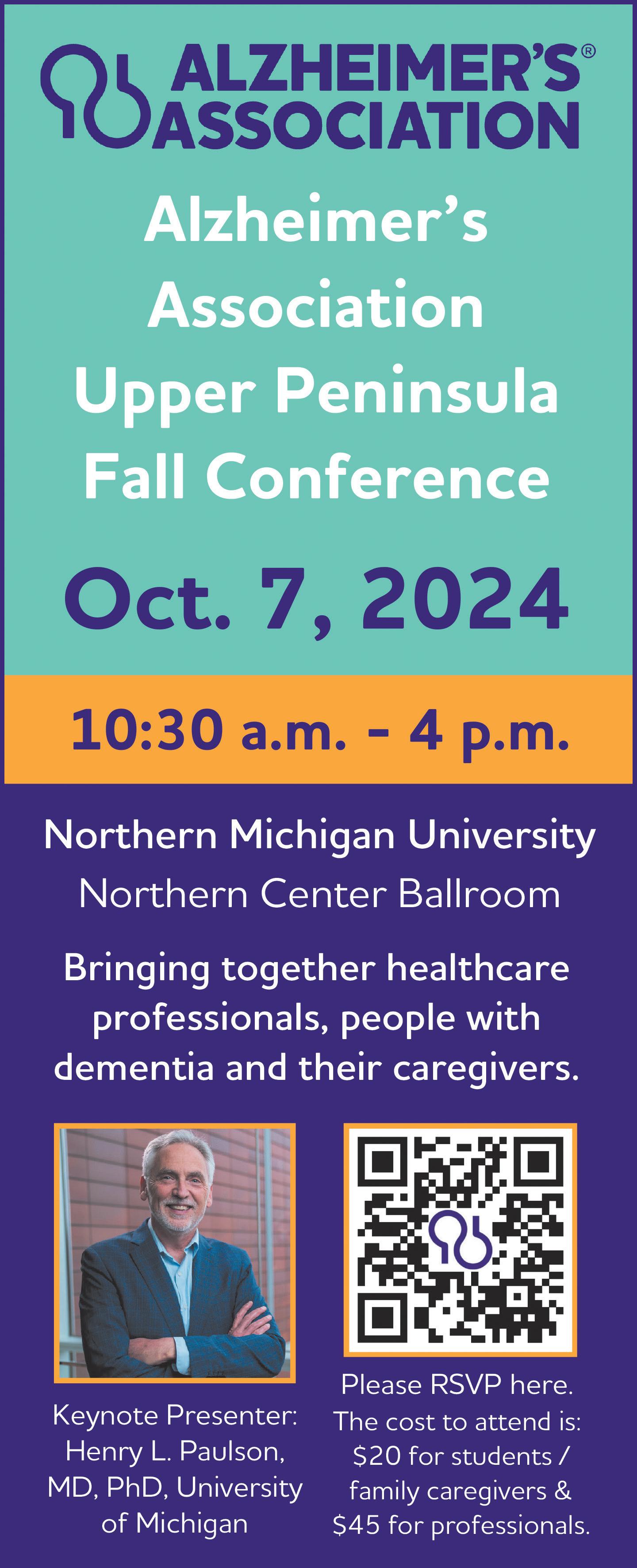 • Parkinson’s Support Group. Open to people living with Parkinson’s and their caregivers. Sept. 18. 2 p.m. Marquette Senior Center, 300 W. Spring St. 906-228-0456.