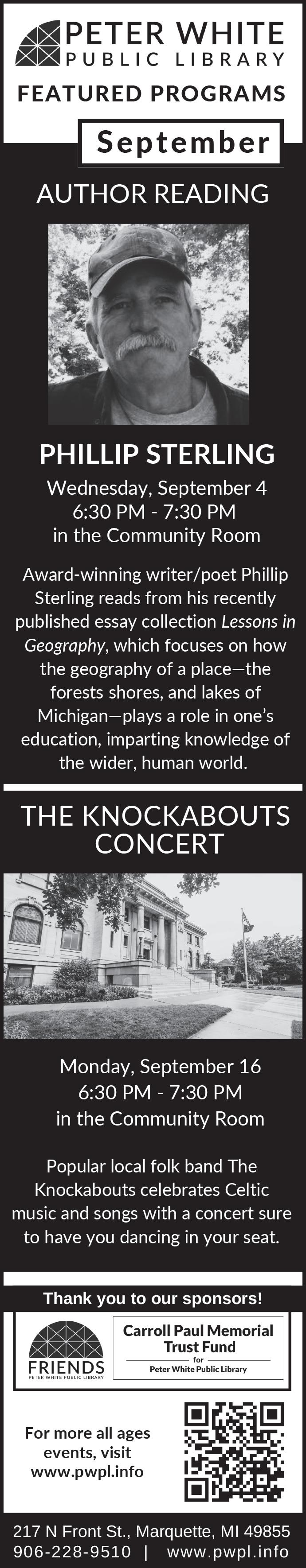 • Friends of the PWPL Fall Used Book Sale. 9:30 a.m. to 5 p.m. Community Room, Peter White Public Library, 217 N. Front St. 906-228-9510.