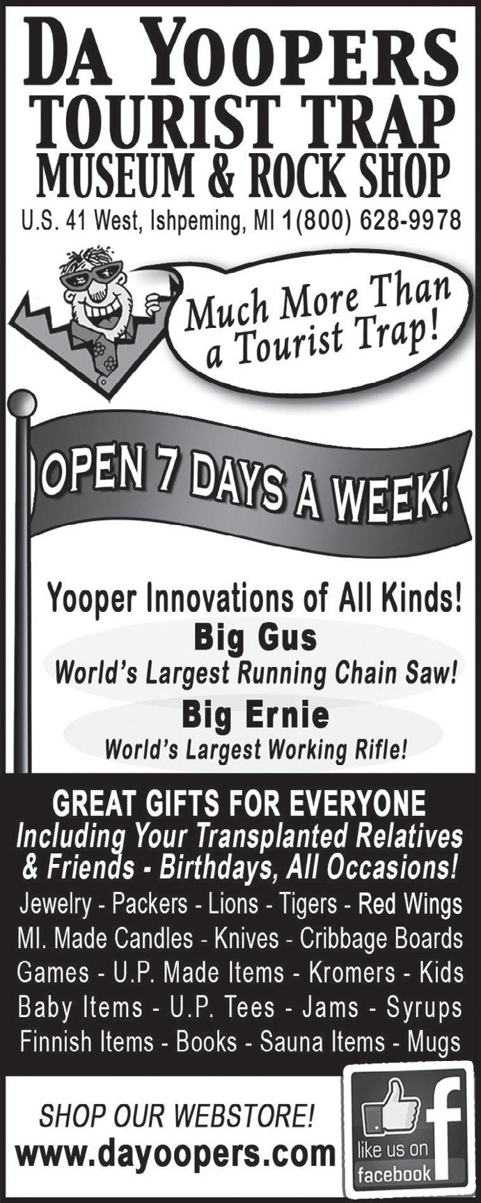 The museum has a collection of more than 125 years of history through artifacts, antiques and memorabilia, including the “Anatomy of a Murder” display. The museum also has an exhibit devoted to the Ford story and a 1900 steamer on display. Guided tours or special showings by appointment. Daily, noon to 5 p.m. 110 W. Main St. 906-323-9016 or 906-3236608, or michigammetownship.com/ michigamme-museum.